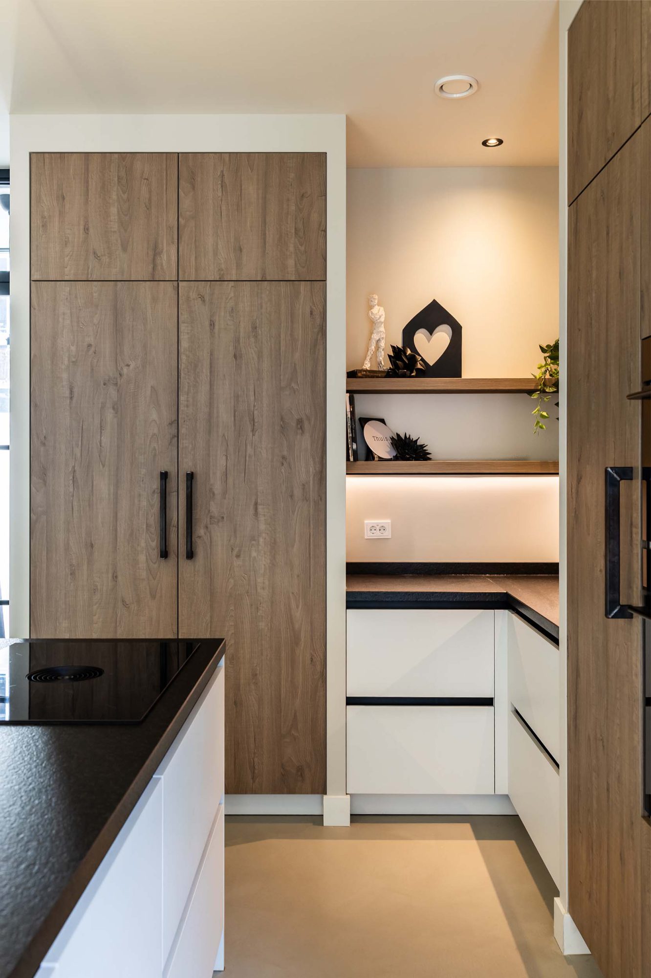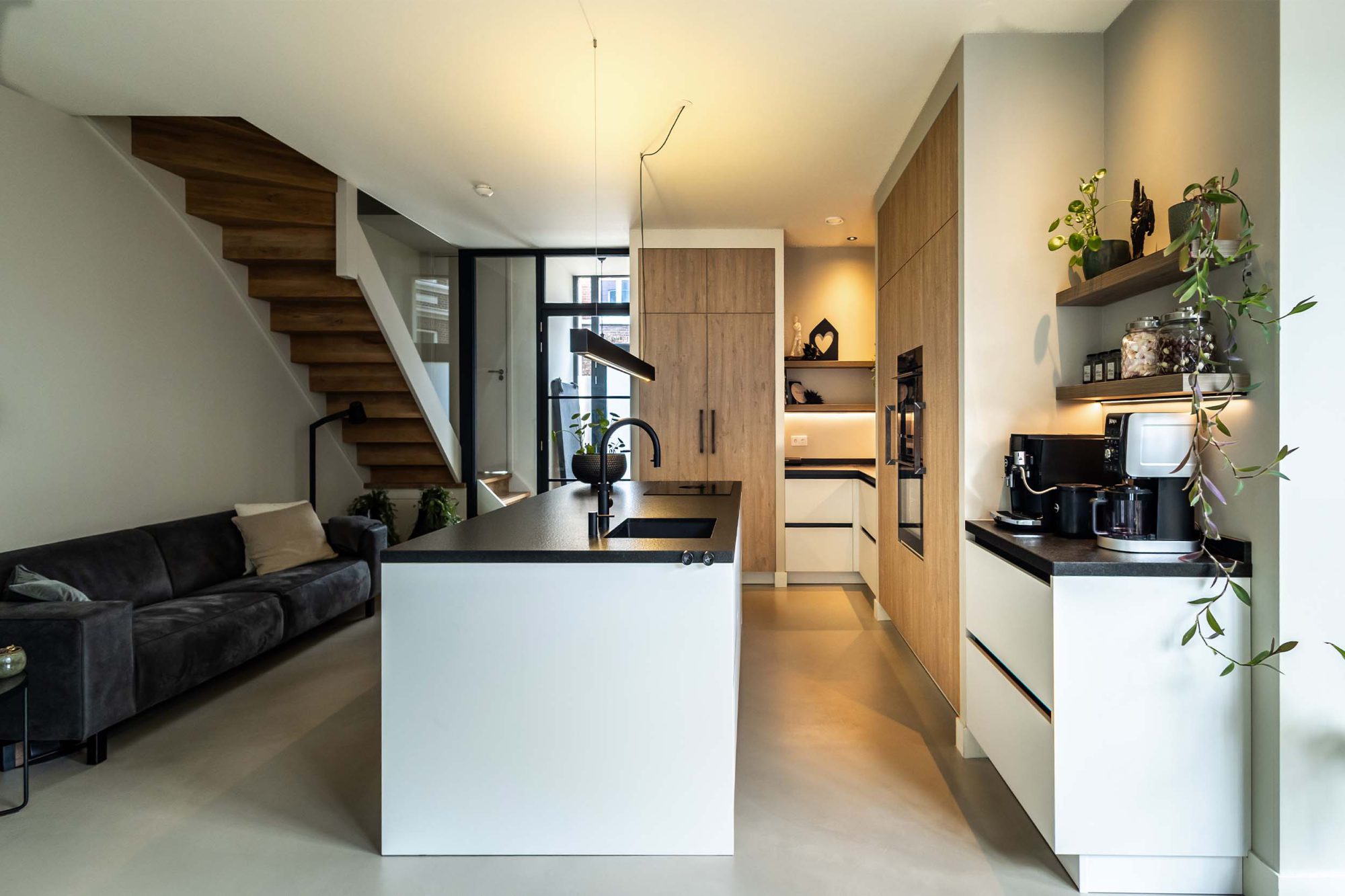 Een daglichtgrijze keuken, prachtig gecombineerd met warme houtaccenten. Deze gezellige leefkeuken biedt volop kastruimte en heeft een sfeervolle uitstraling. Het is de ideale plek om te koken, samen te komen en te genieten van een harmonieuze mix van stijl, functionaliteit en huiselijkheid.