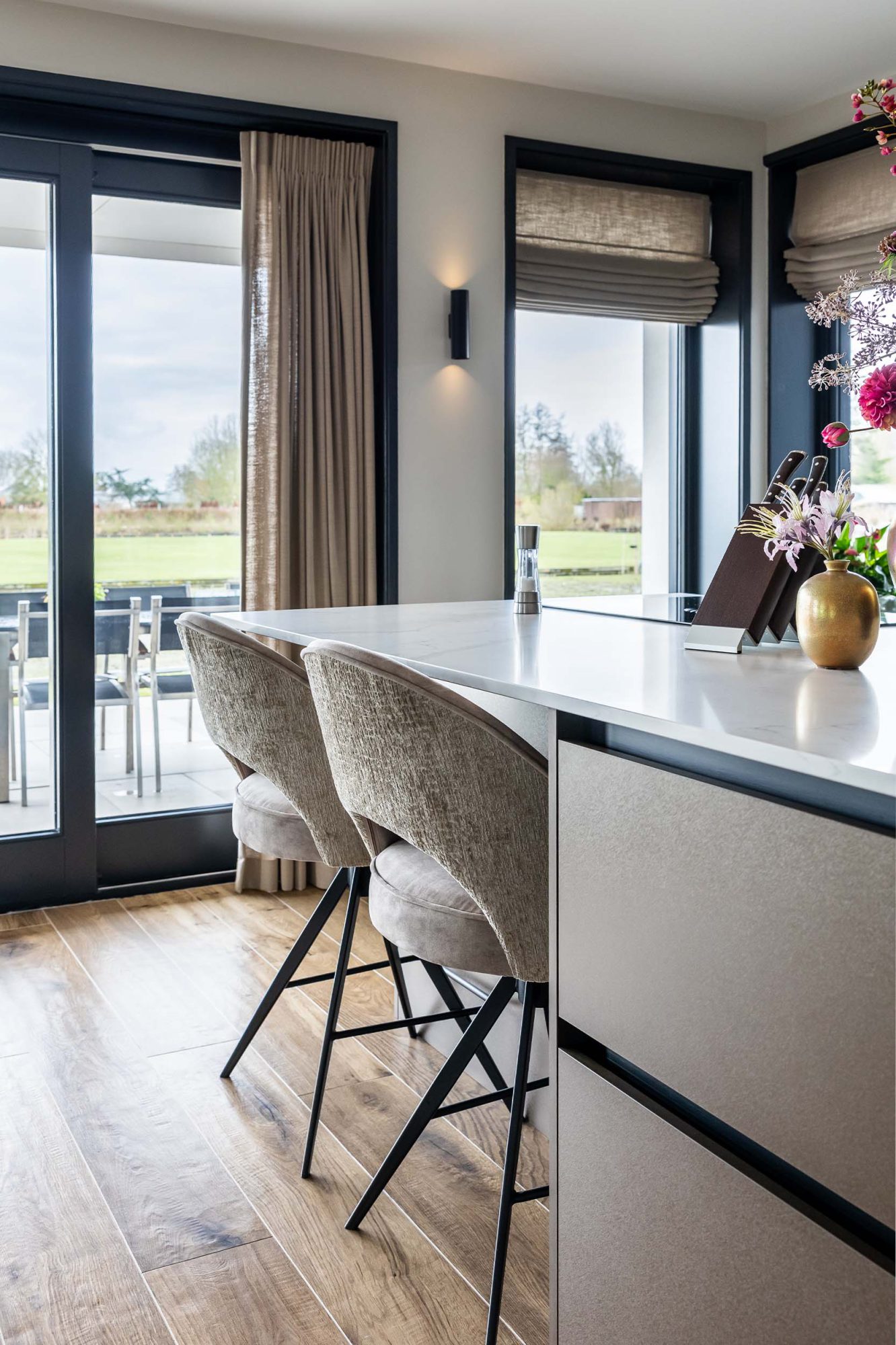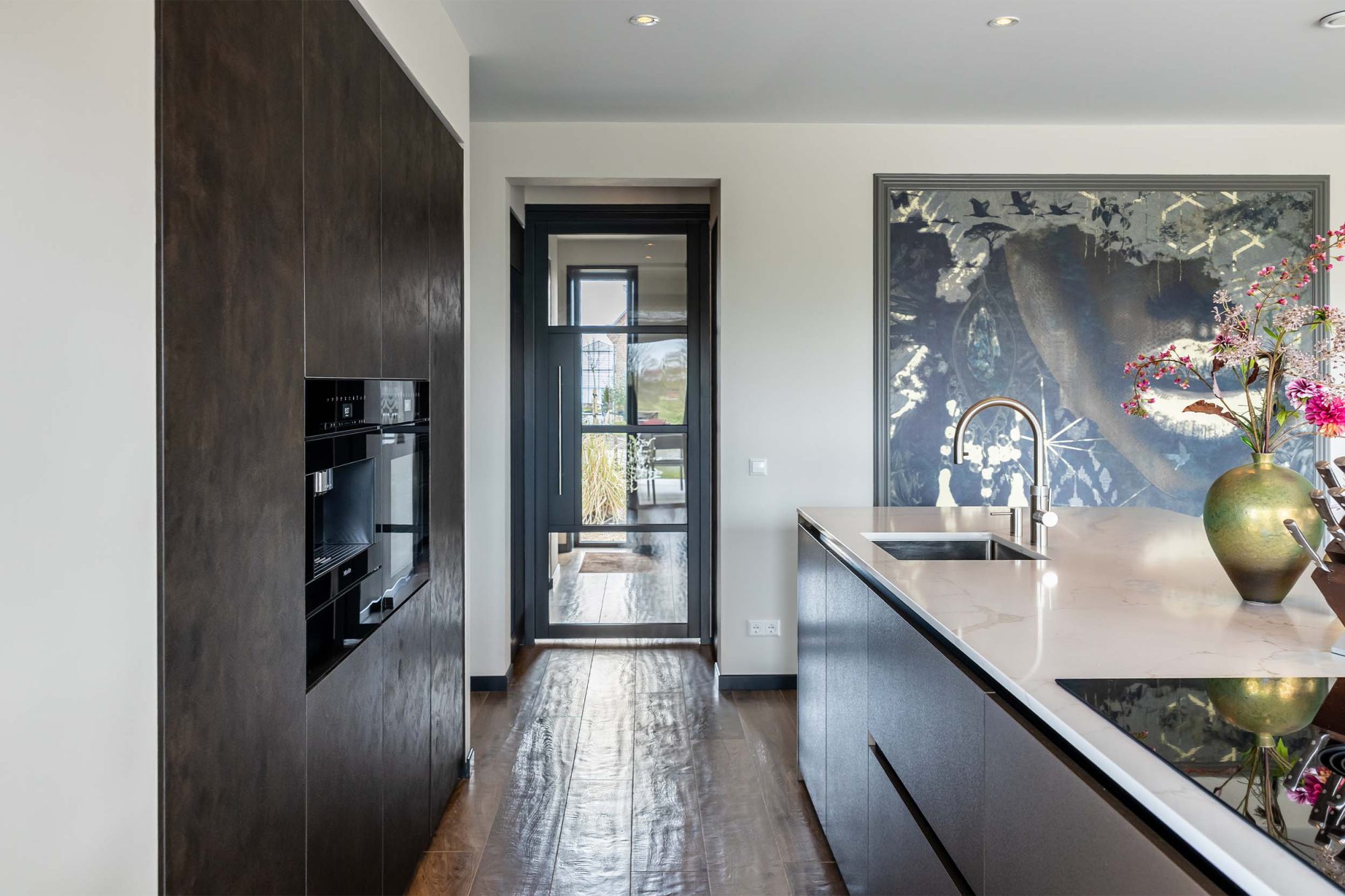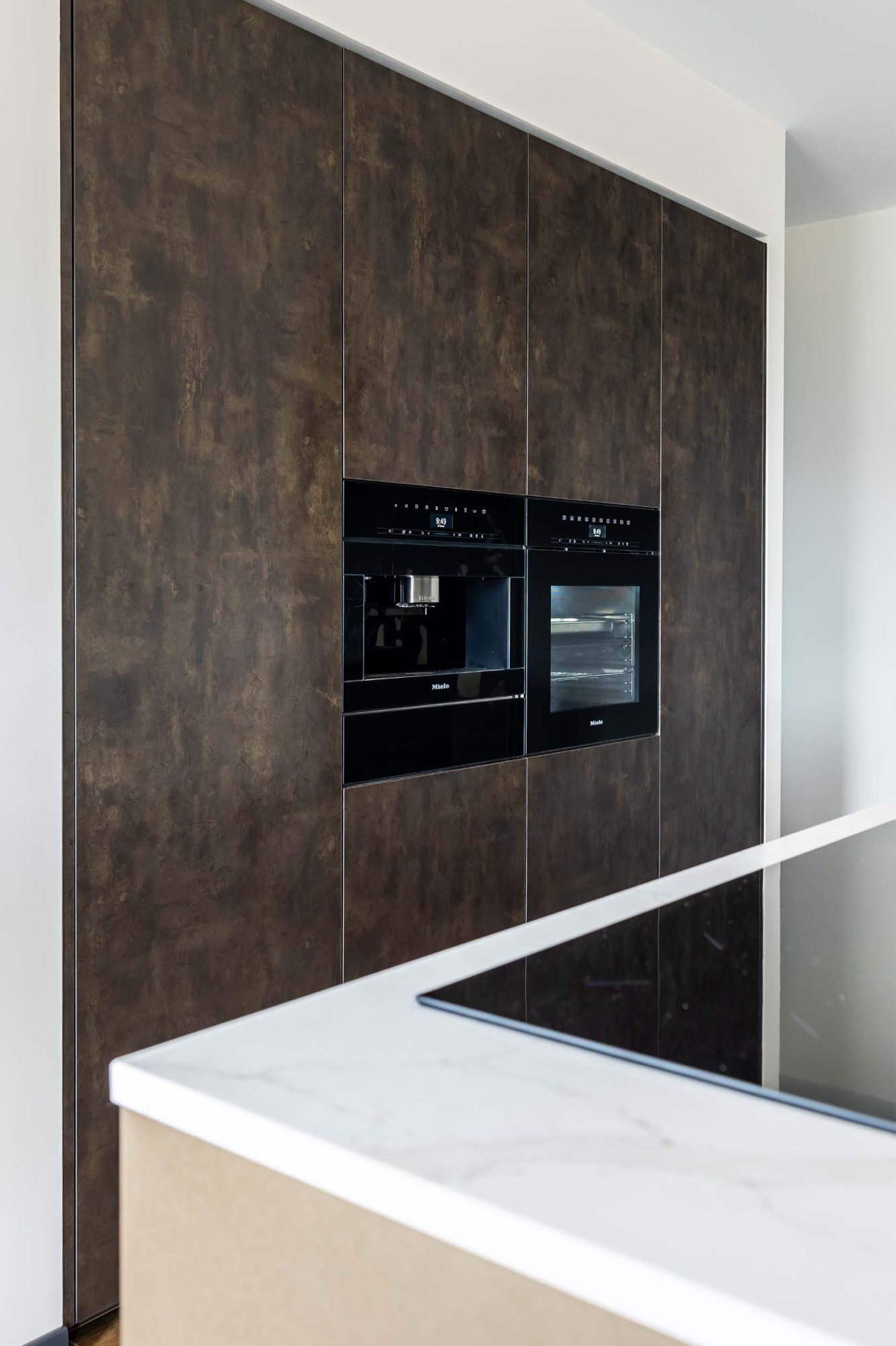 Deze keuken combineert bronzen metaallook fronten met zwart staal voor een stijlvolle uitstraling. Het composiet met marmerstructuur en warme tinten zorgt voor een elegante sfeer. Met een royale wijnkoeler en een doordachte kastenwand in de bijkeuken geniet u van optimaal comfort en slimme oplossingen.