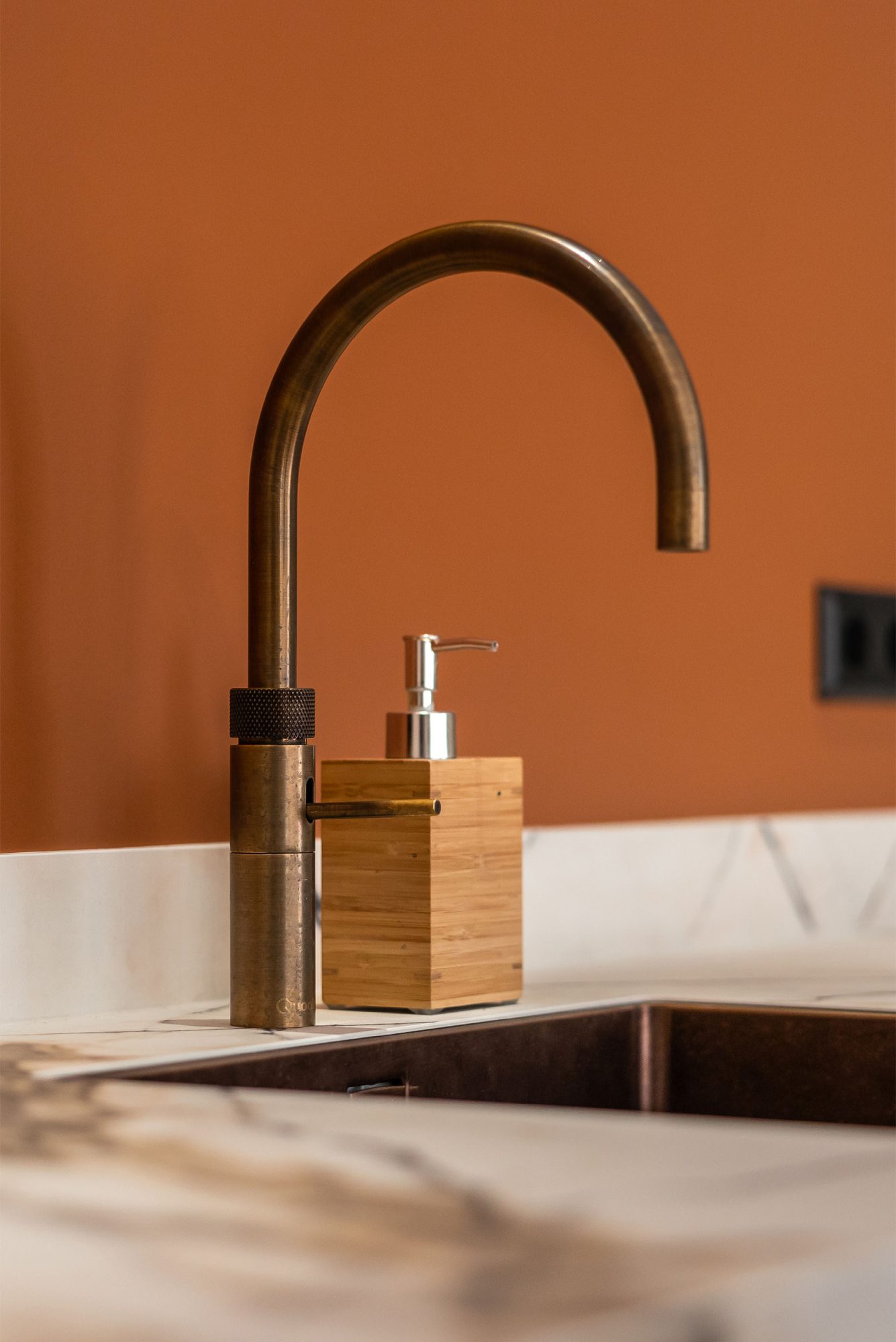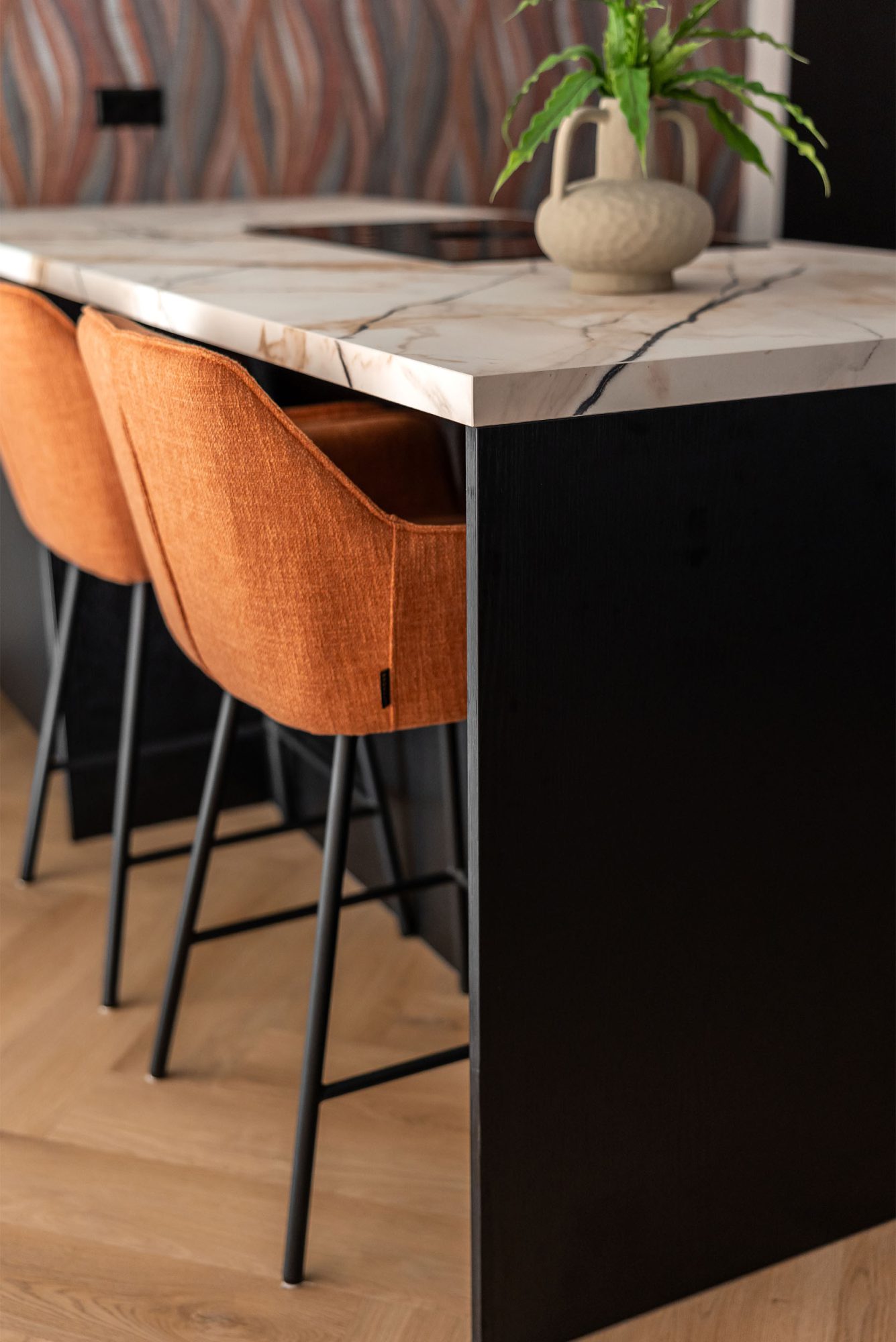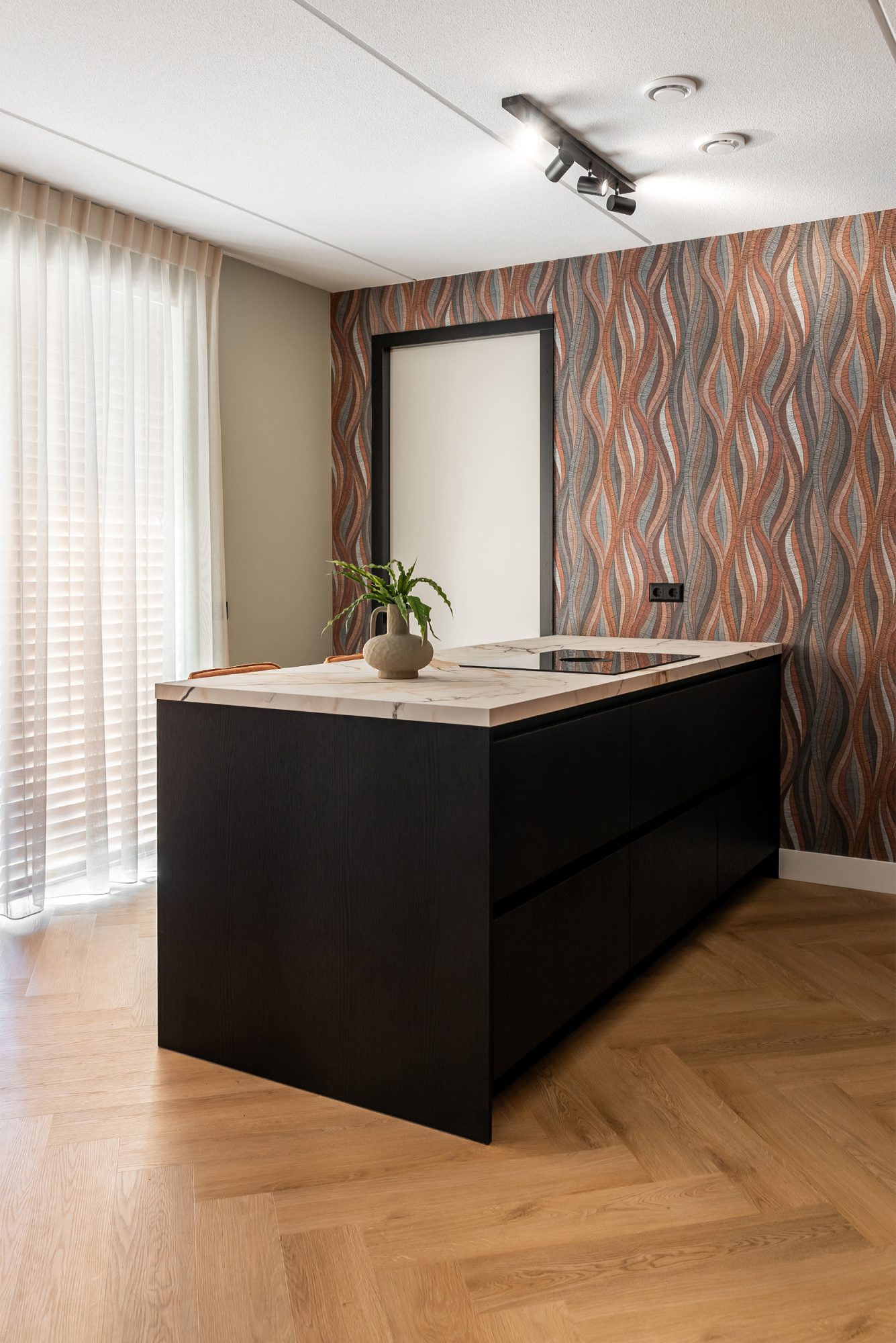 Deze keuken is een echte ruimtewinner! Het unieke ontwerp dat om de hoek loopt, biedt royale werkruimte. De warme tinten van de muur en het werkblad vloeien mooi in elkaar over, wat zorgt voor een harmonieuze en elegante sfeer. Een keuken die verrast en inspireert!