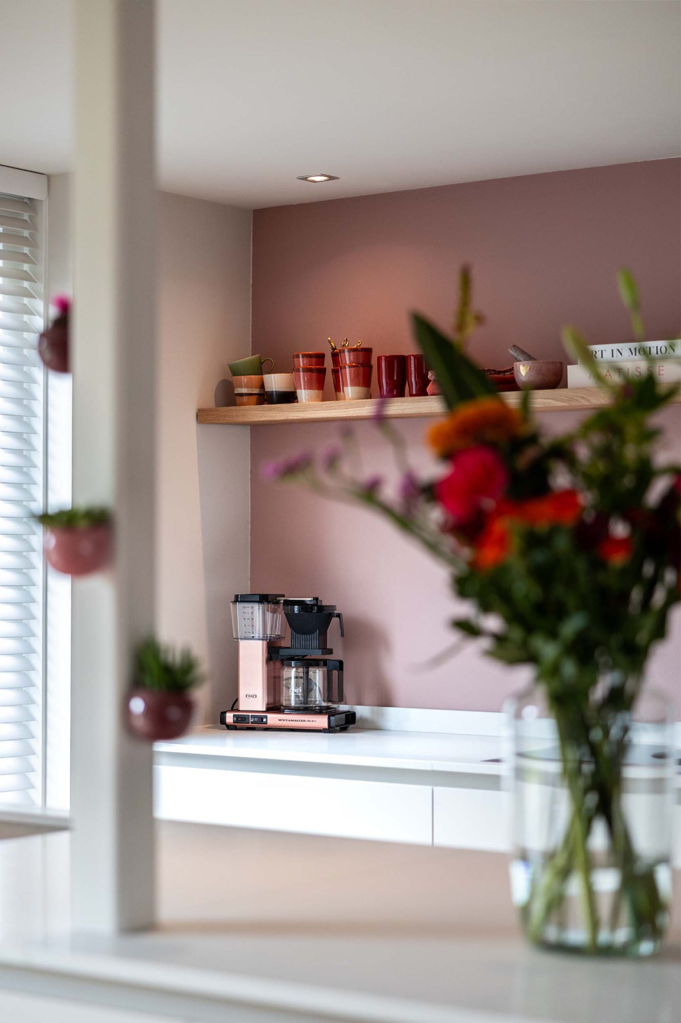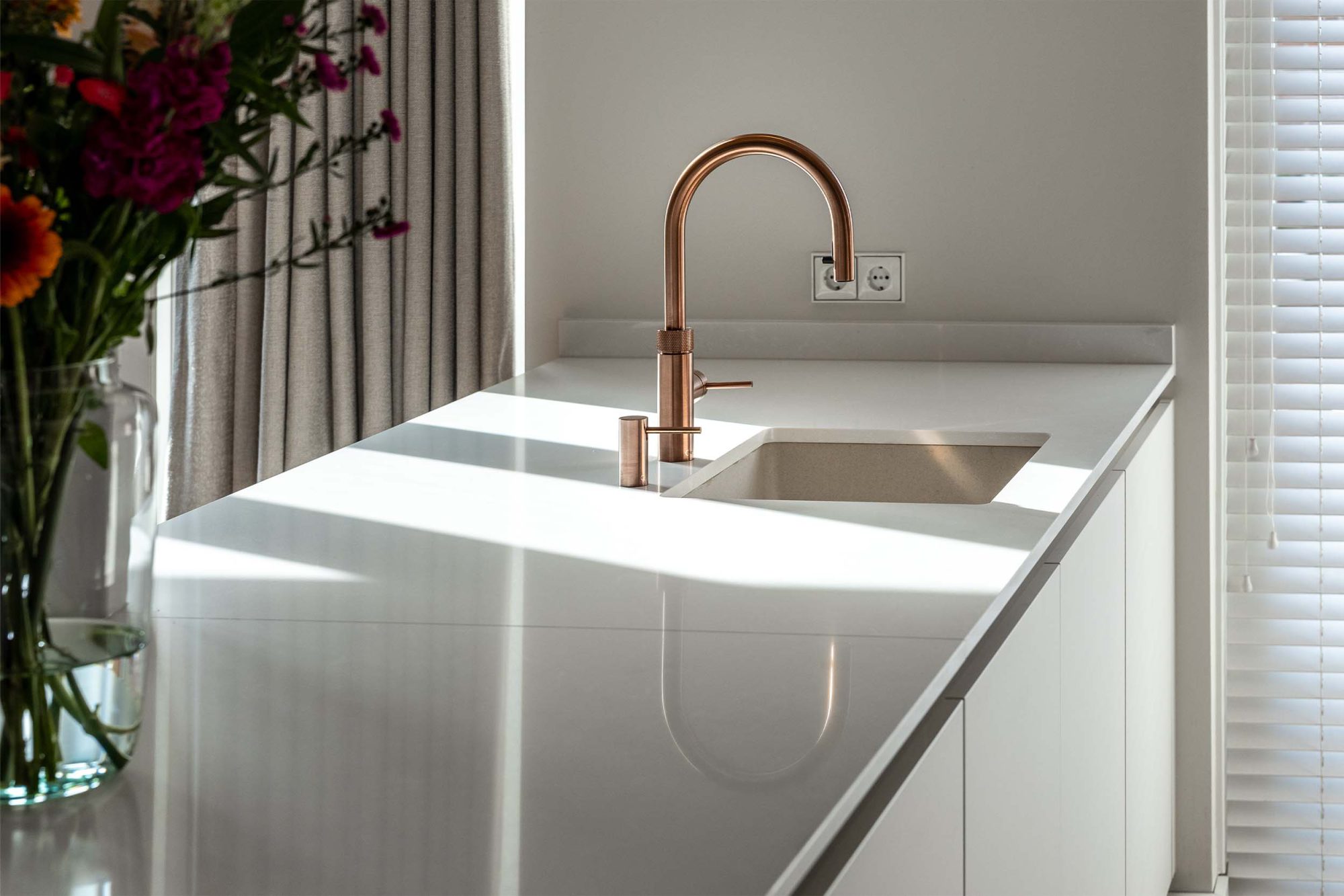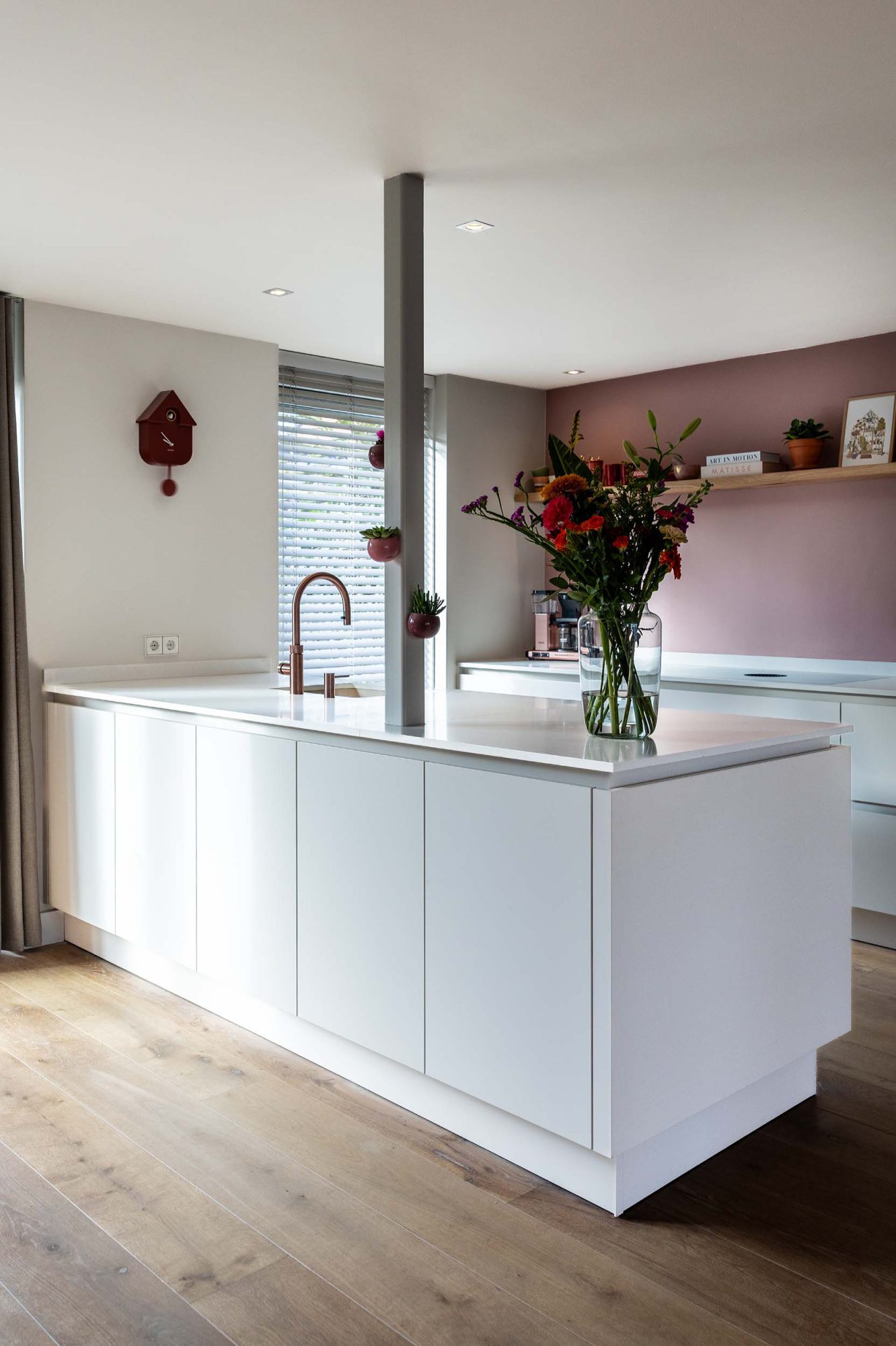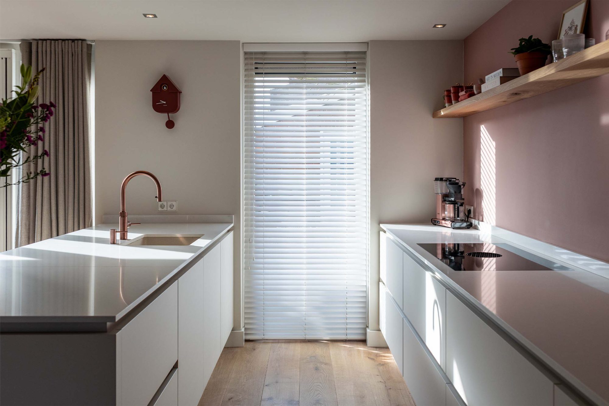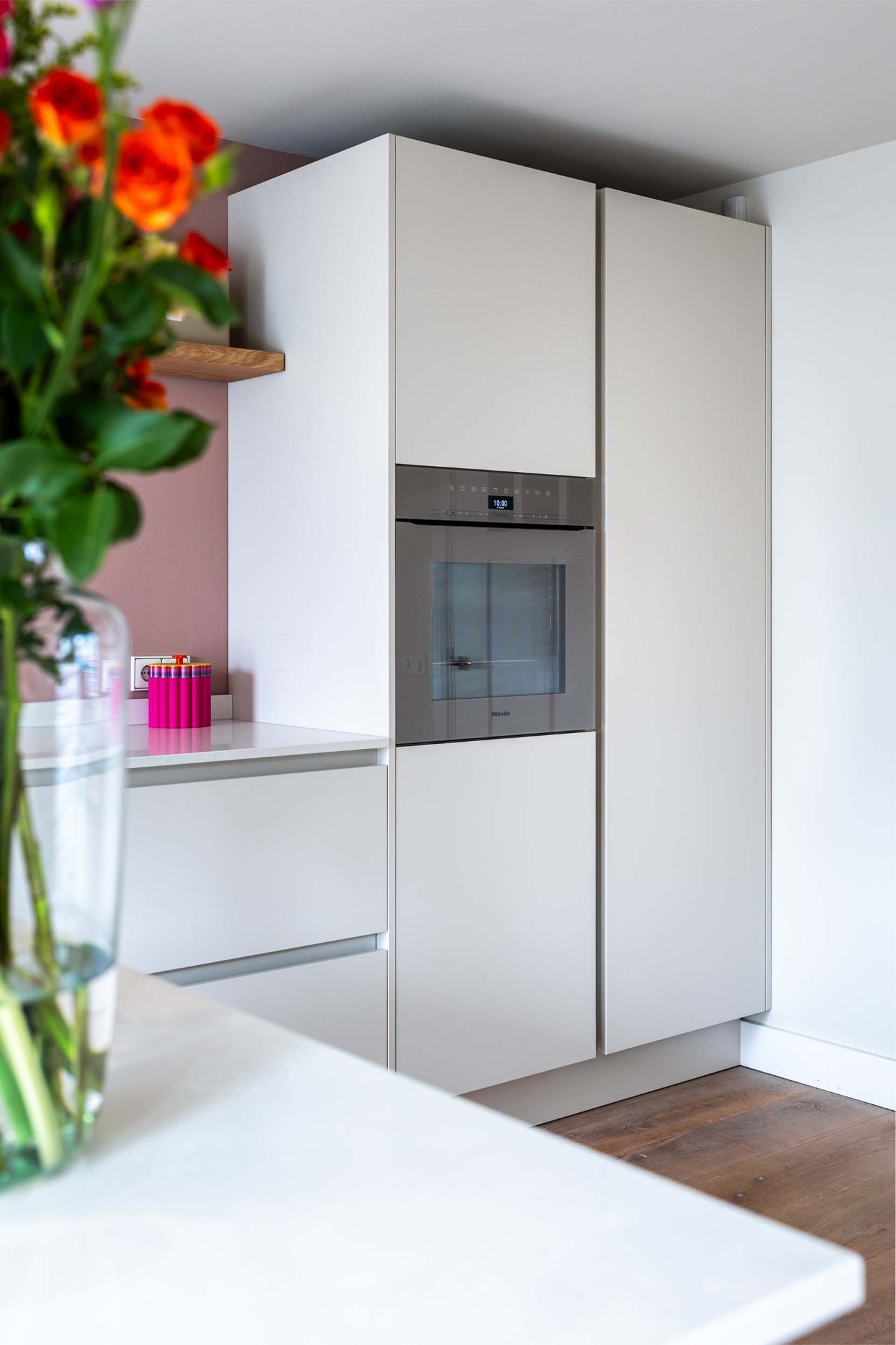 Een strakke, rustige keuken in Beach Grey, aangevuld met een bijpassende oven in de kleur Pearl Beige. De rosékoperen Quooker en de roze muur vormen een mooie combinatie, wat zorgt voor een harmonieuze en stijlvolle uitstraling. Ideaal voor die tijdloze en elegante keuken!