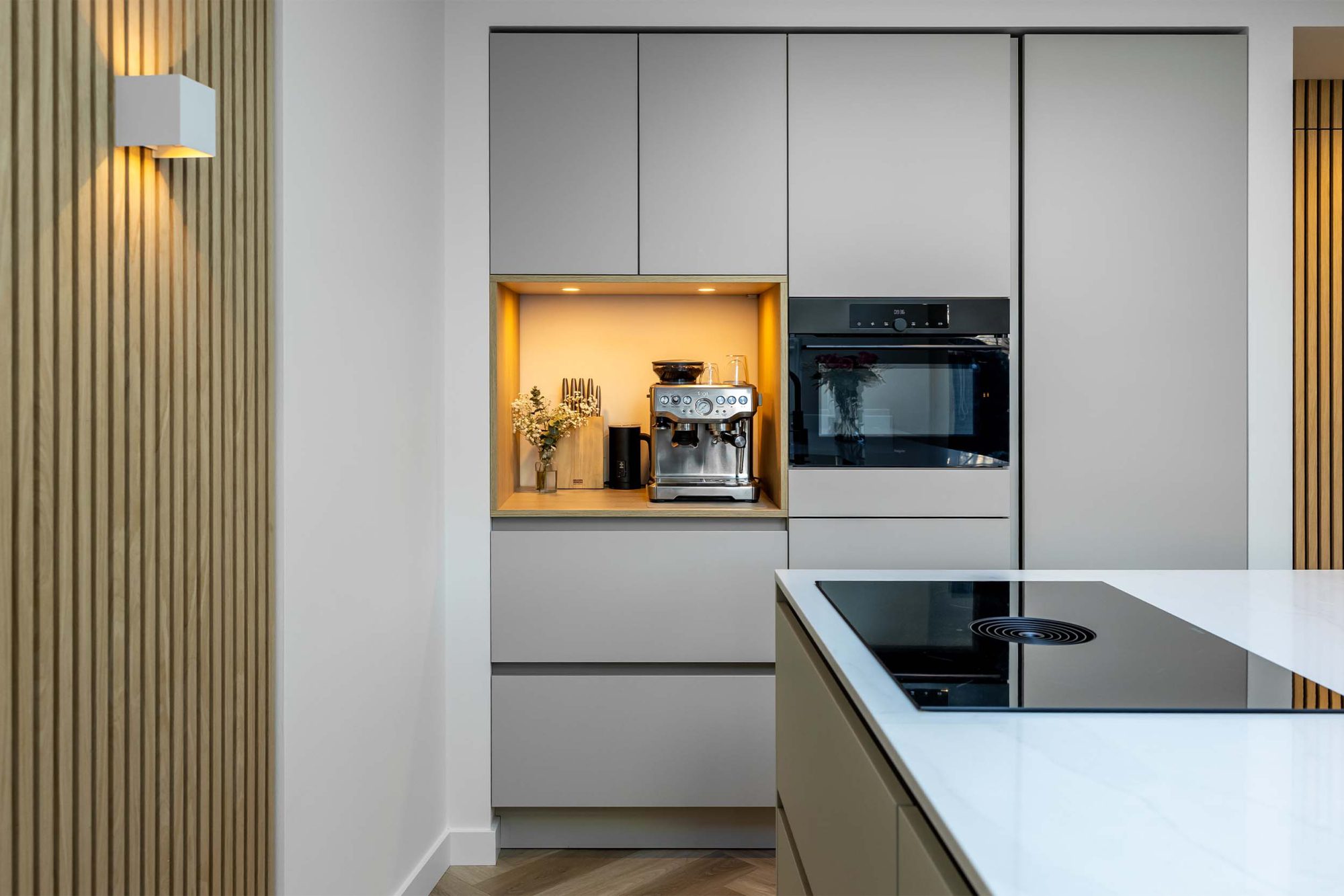 Bekijk deze mooie beige keuken in de kleur Kashmir, prachtig gecombineerd met warme houten details. Het composieten werkblad met een subtiele marmerstructuur voegt een luxe touch toe. Samen vormen deze elementen een stijlvolle en tijdloze keuken met een natuurlijke, elegante uitstraling.