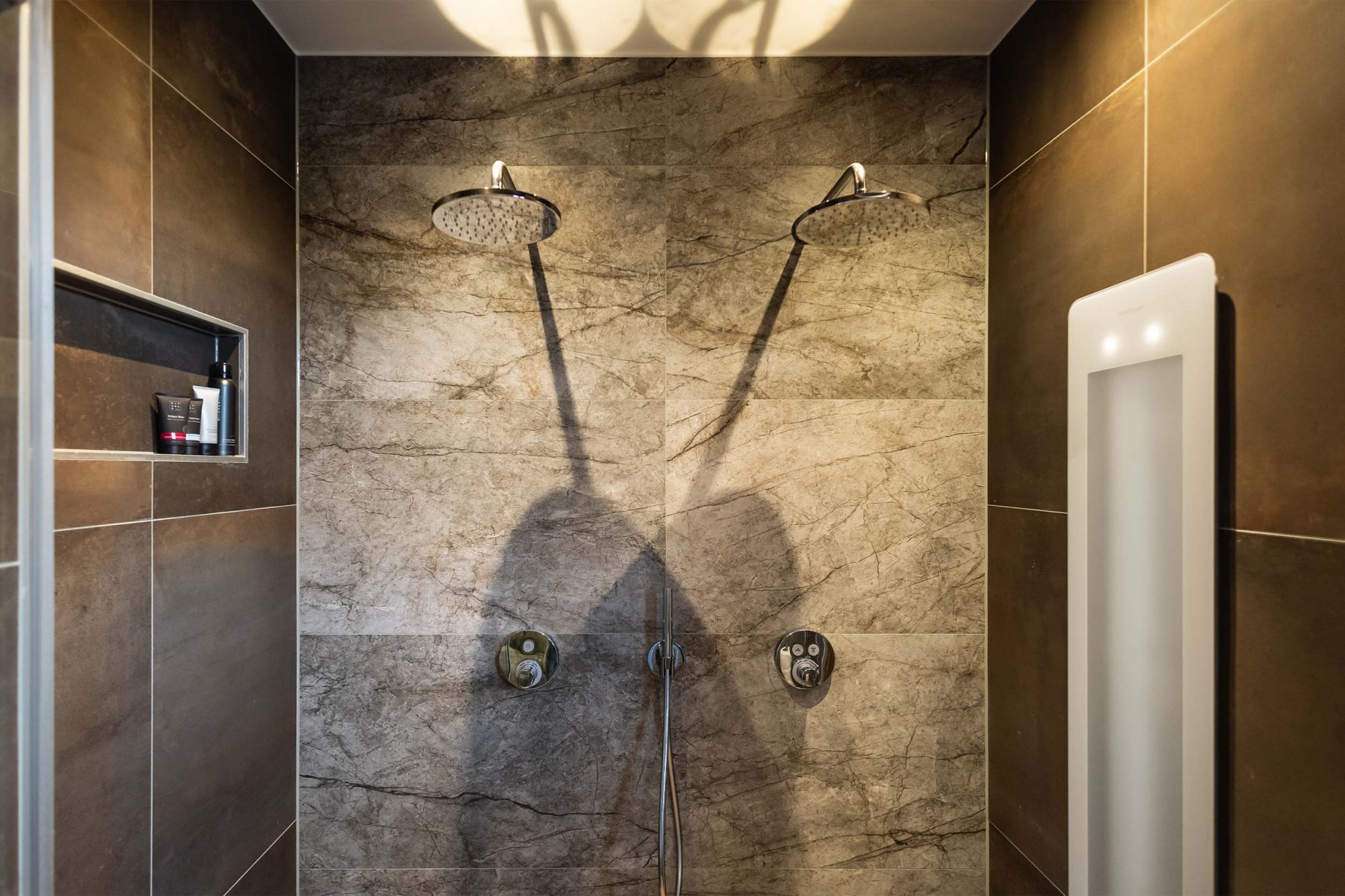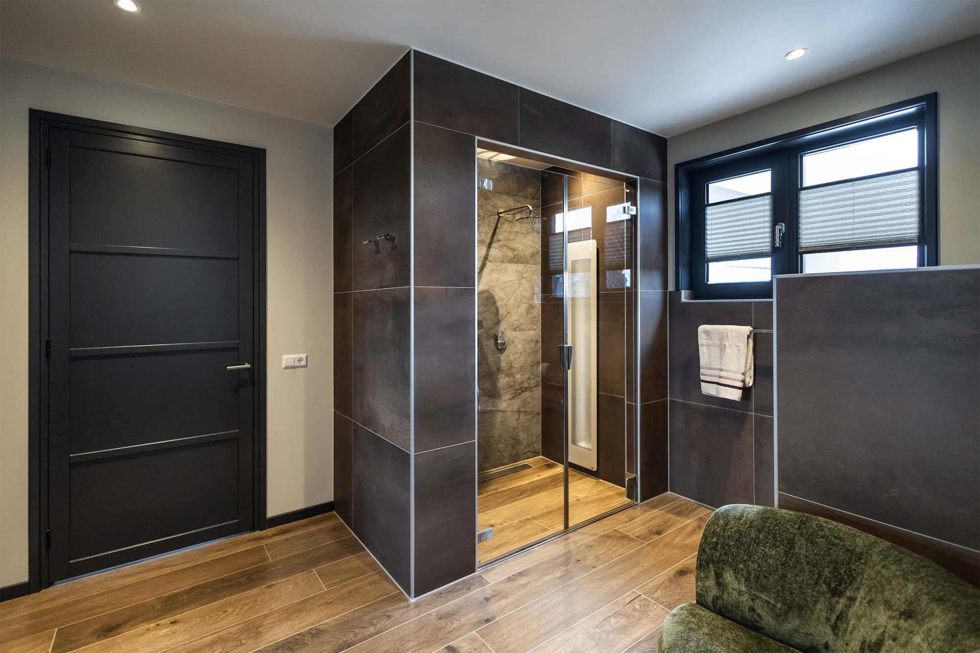 Ervaar de rust en luxe van een ensuite badkamer met een doorlopende vloer en donkere tegels. Stap moeiteloos uit bed en geniet van de ultieme wellnesservaring met de Sunshower. Primabad levert maatwerk meubelen die perfect passen bij elke stijl, zodat uw badkamer een persoonlijke touch krijgt.
