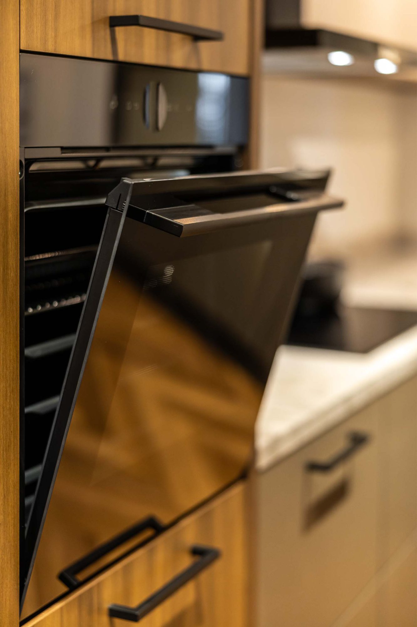 De olijfgroene kleur van deze keuken geeft een moderne, strakke uitstraling met subtiele grepen. Het natuurstenen werkblad voegt een vleugje luxe toe, terwijl de zwarte afzuiging zorgt voor een stoer contrast. Notenhouten plankjes bieden warmte en uitnodiging. Perfect in balans!