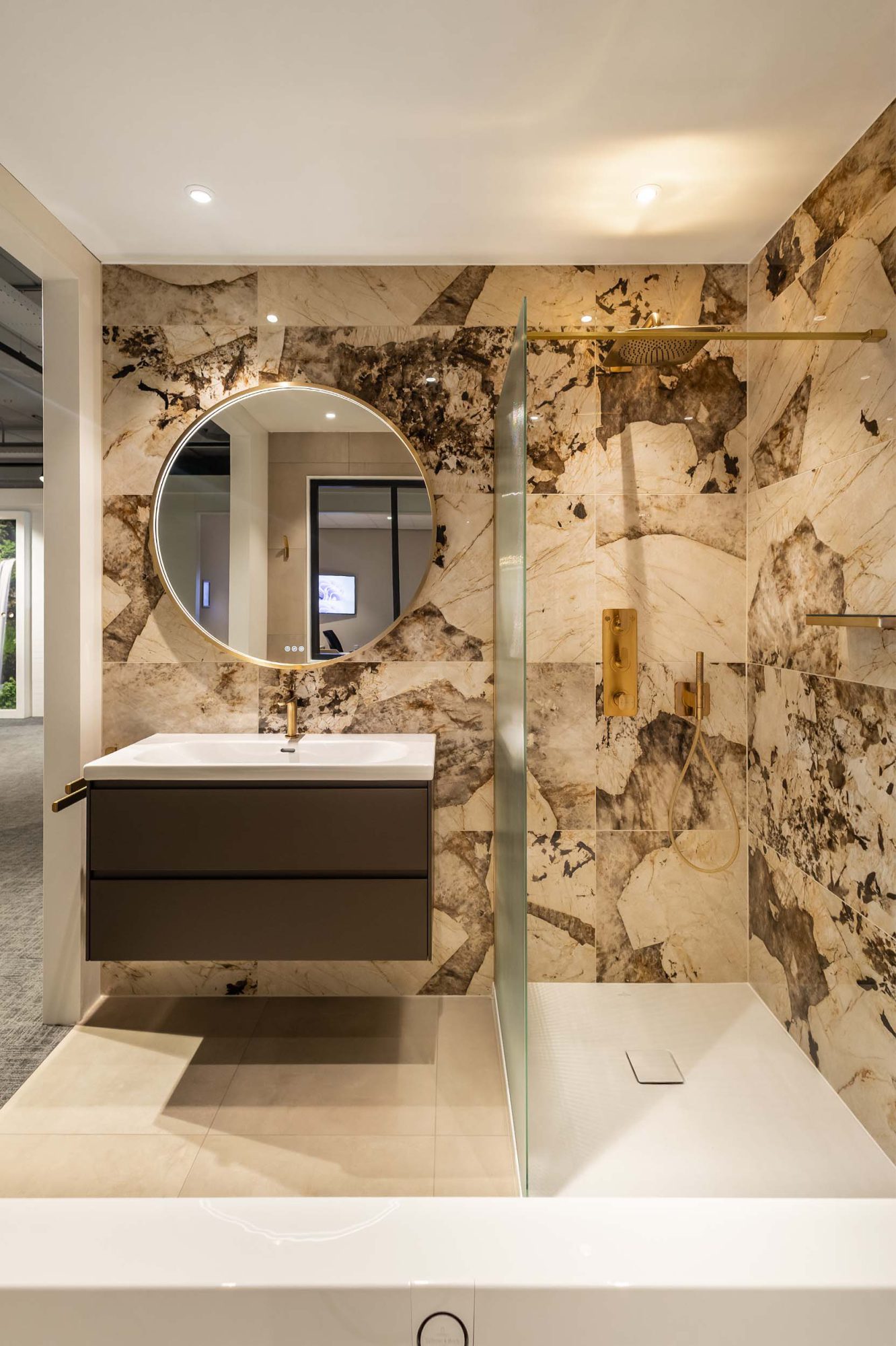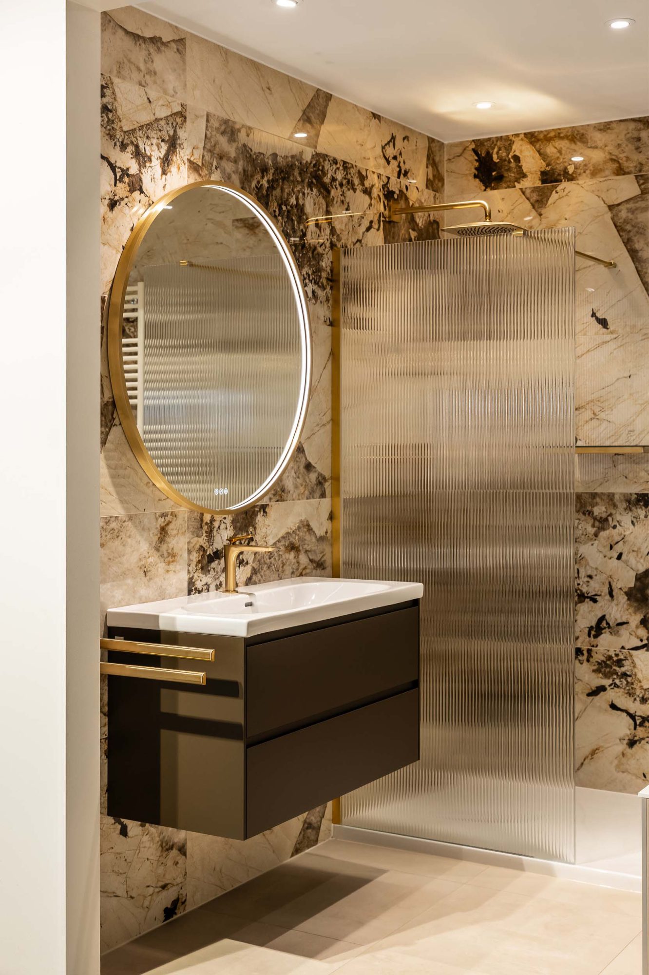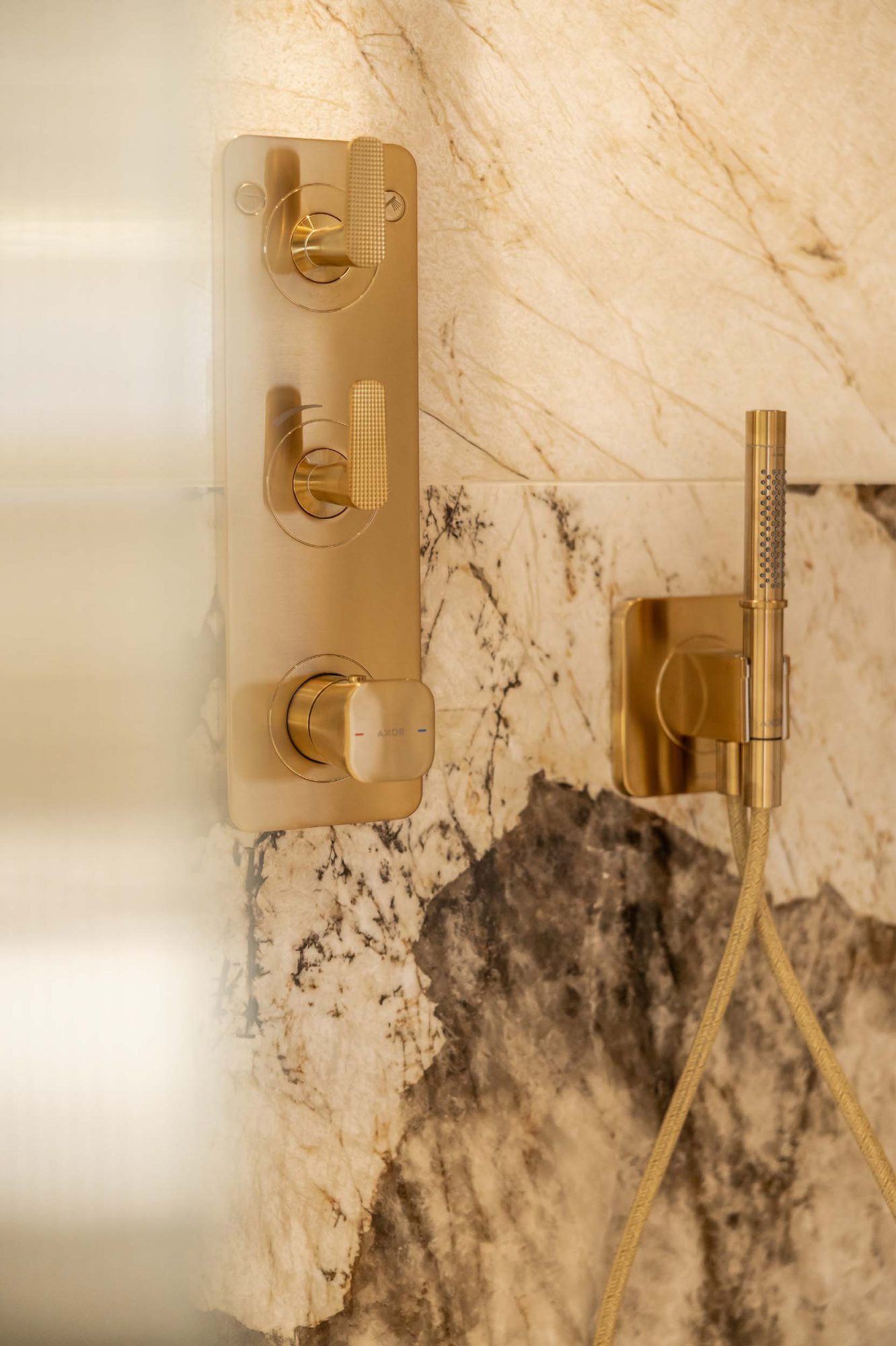 Deze badkamer combineert gedurfde elegantie met tijdloze klasse. De Desert Soul tegels van Atlas Concorde brengen warmte, terwijl de gouden Axor kranen luxe toevoegen. Het resultaat is een modern-klassieke uitstraling die uniek, stijlvol en perfect in balans is.