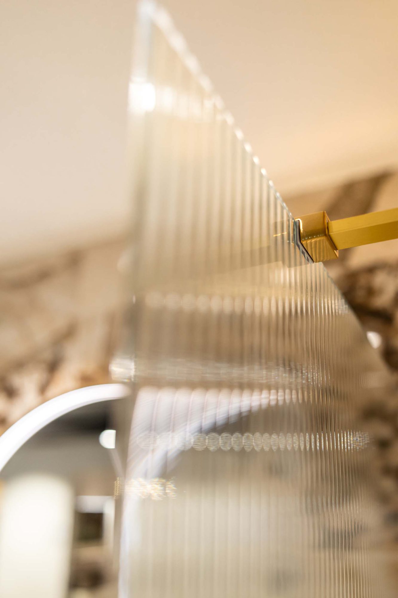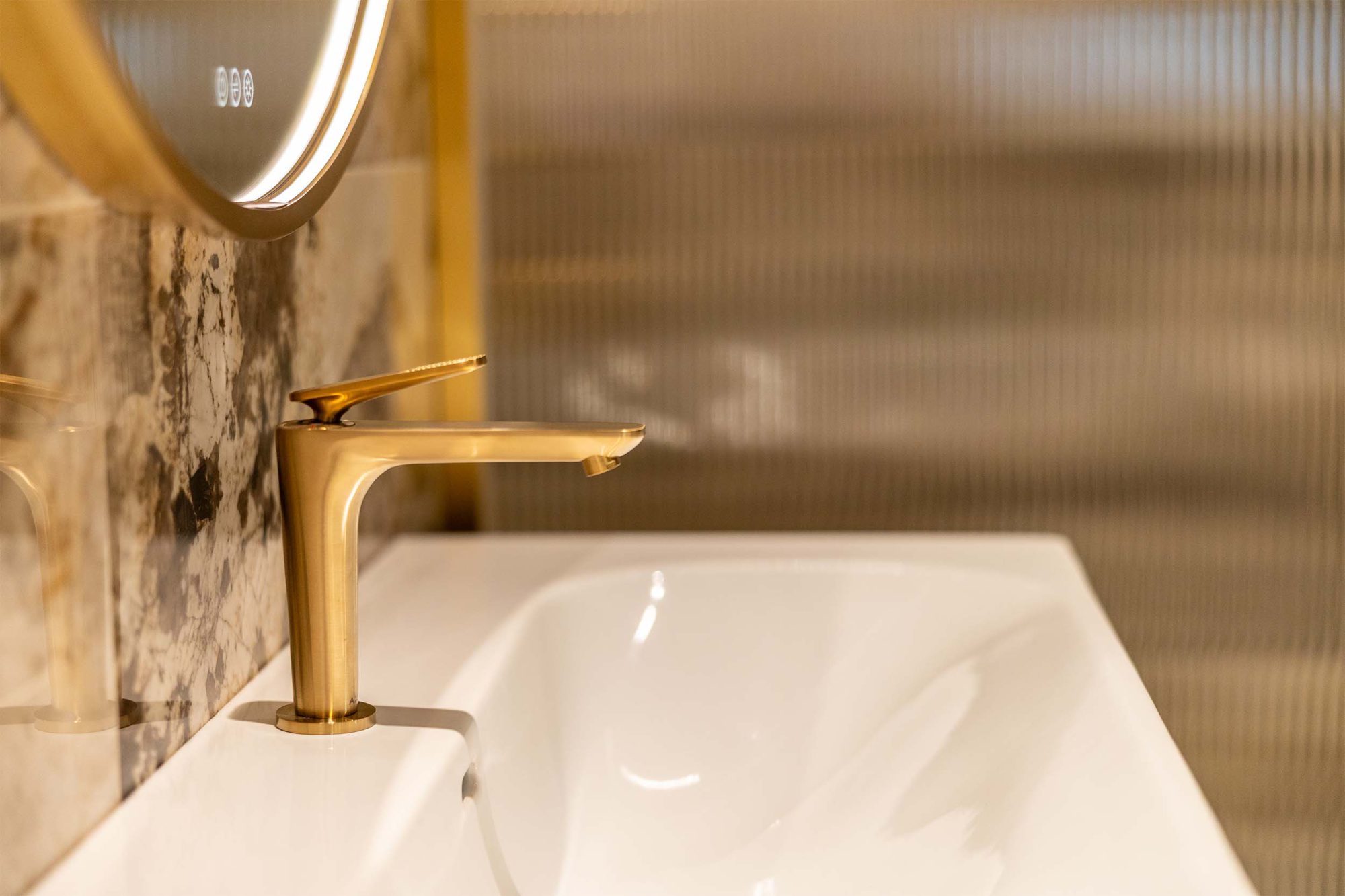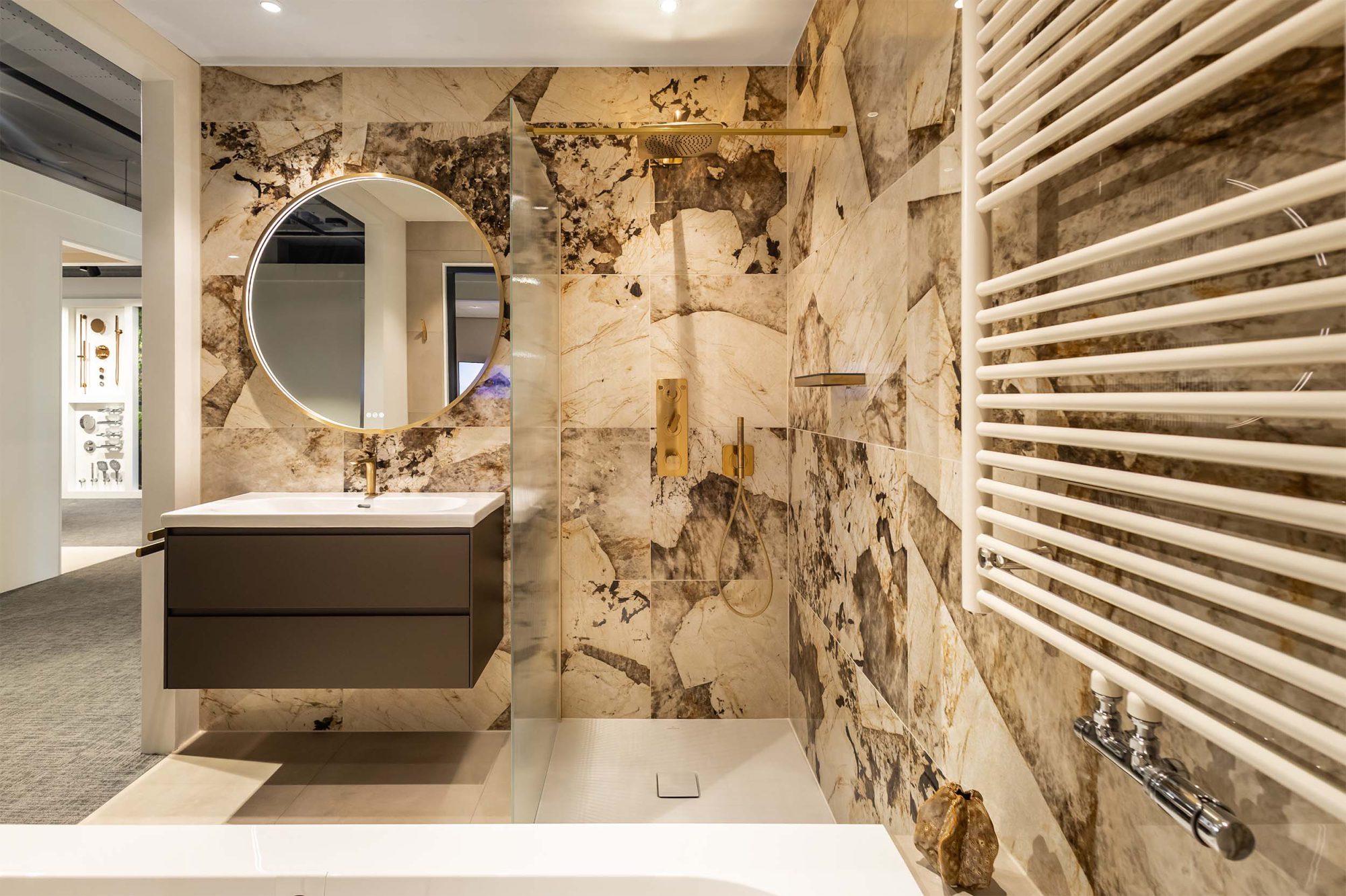 Deze badkamer combineert gedurfde elegantie met tijdloze klasse. De Desert Soul tegels van Atlas Concorde brengen warmte, terwijl de gouden Axor kranen luxe toevoegen. Het resultaat is een modern-klassieke uitstraling die uniek, stijlvol en perfect in balans is.