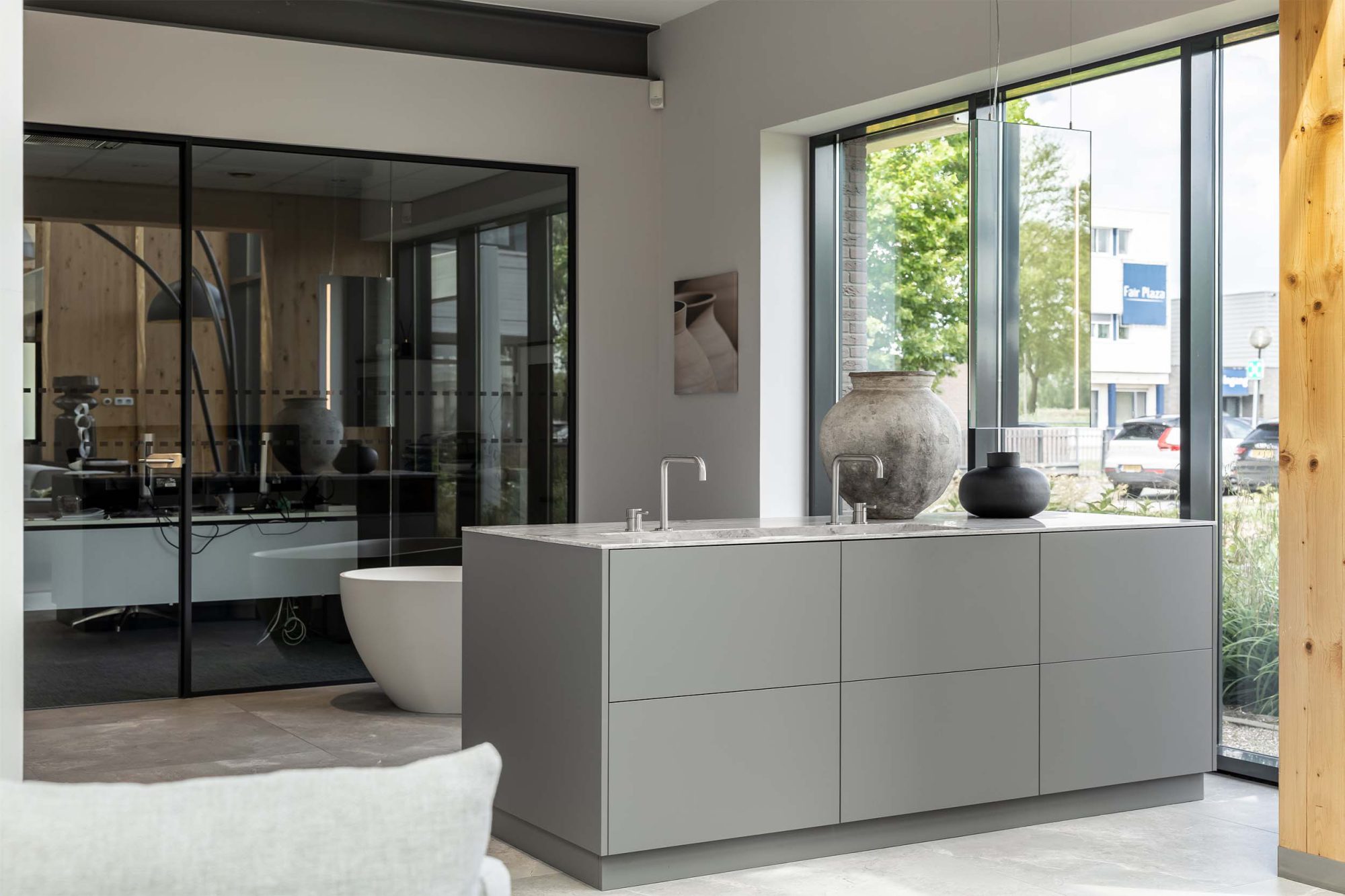 Geen keukeneiland, maar een op maat gemaakt badkamermeubel van ELISE Meubelen. In combinatie met het beige bad van Detremmerie creëert u een luxe badkamer met functionaliteit en perfect afgestemde details voor uw persoonlijke stijl.