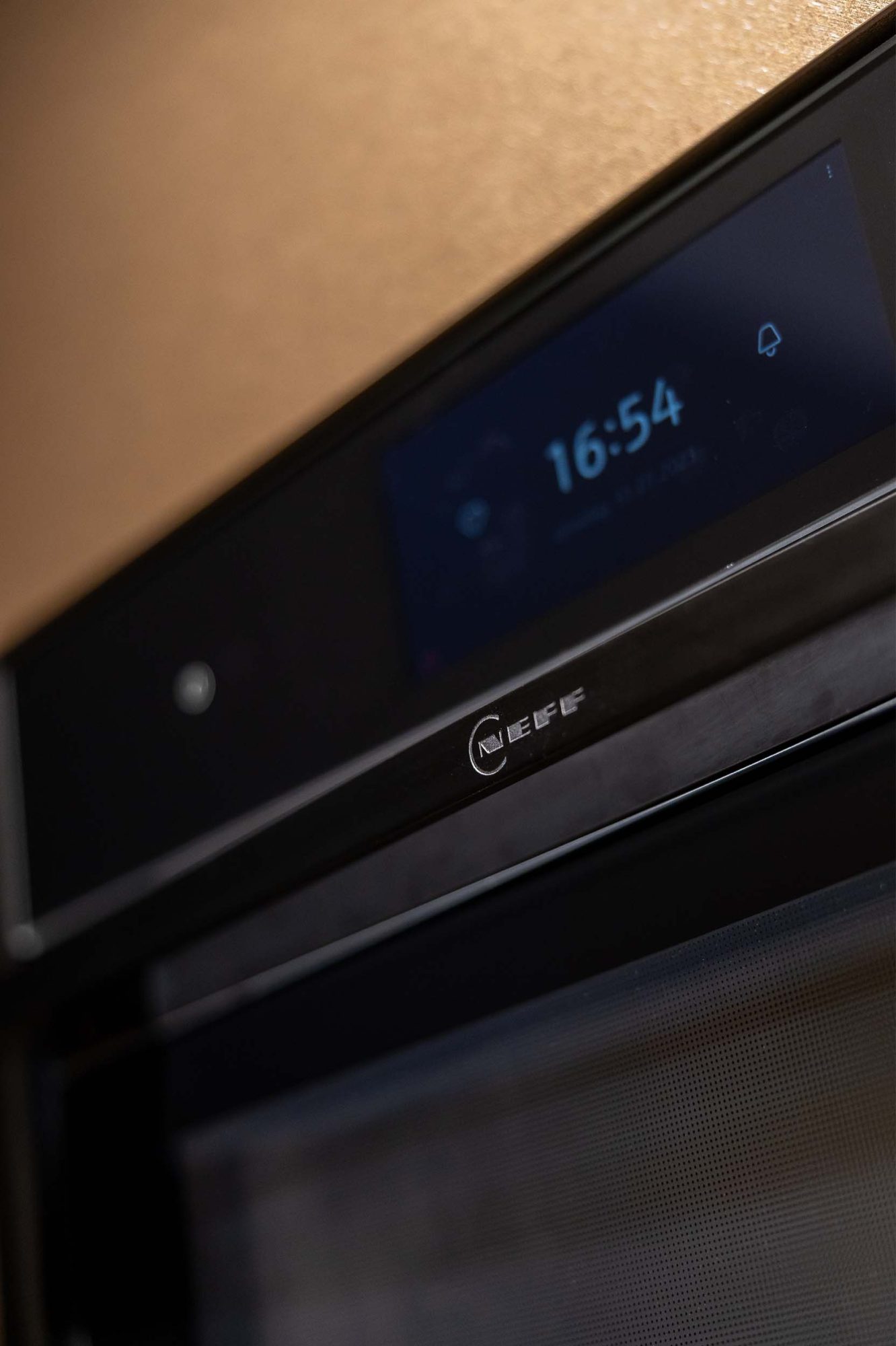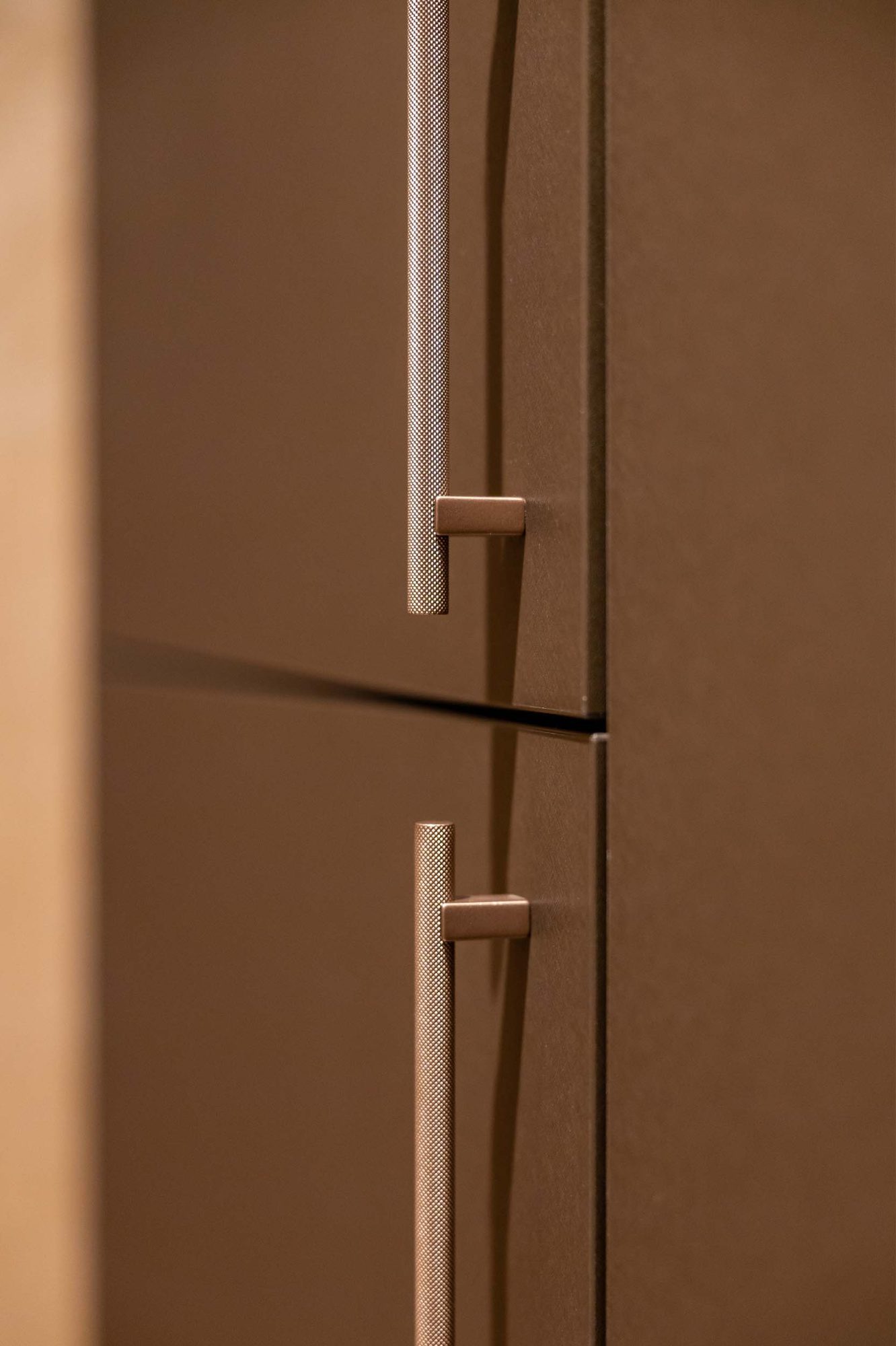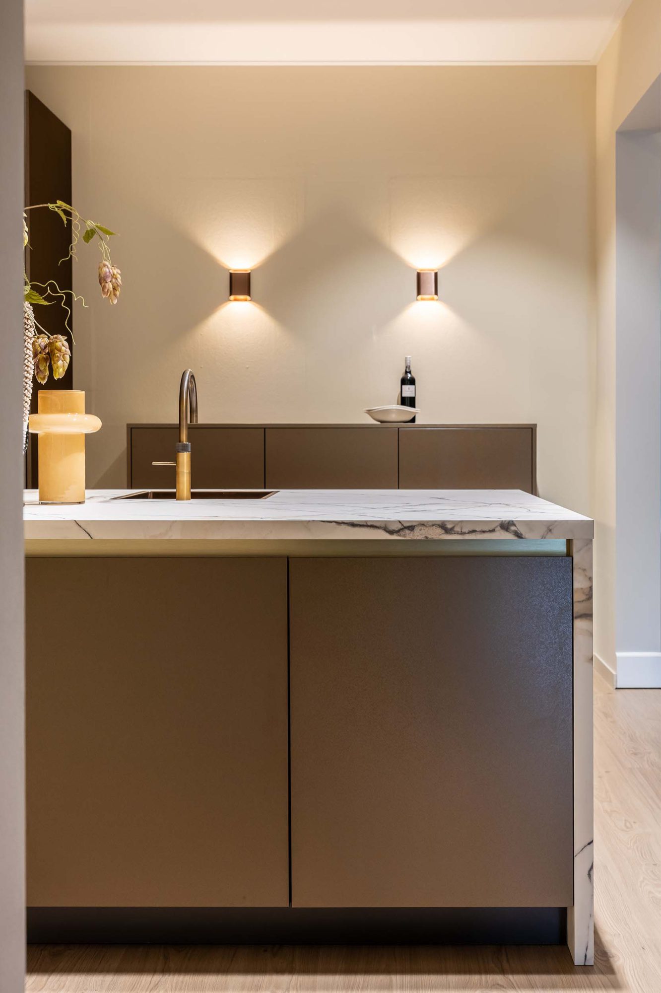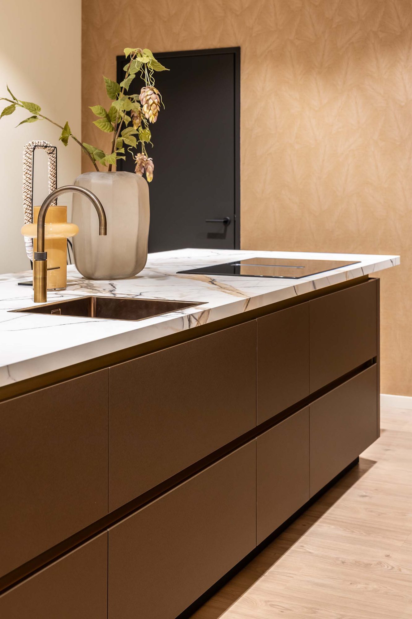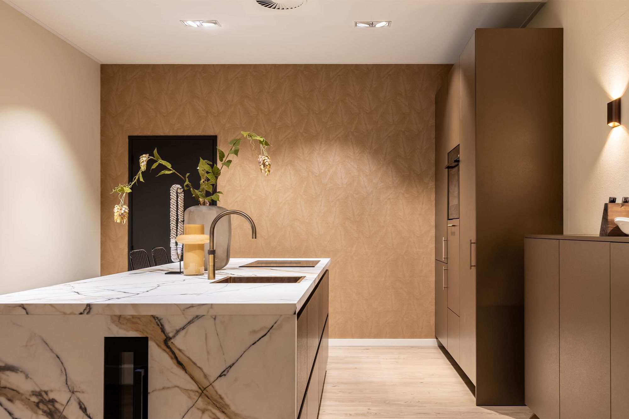 Met warme kleuren en een stoer werkblad straalt deze keuken uit de MK-Collectie sfeer uit. De ingebouwde wijnkoeler voegt stijl toe, terwijl het grote eiland met zitgedeelte perfect is voor sociaal koken. Daarnaast biedt de hoge kastenwand volop opbergruimte en versterkt het de robuuste uitstraling.