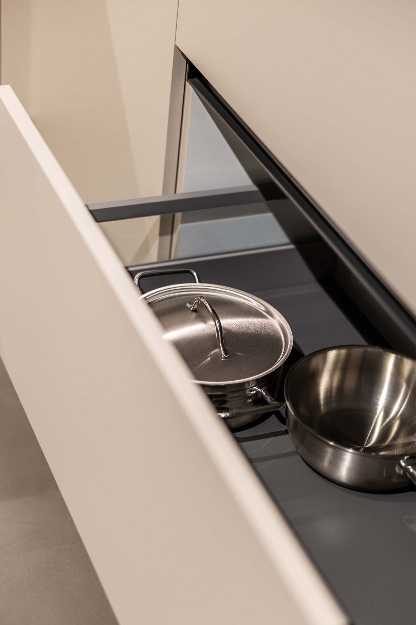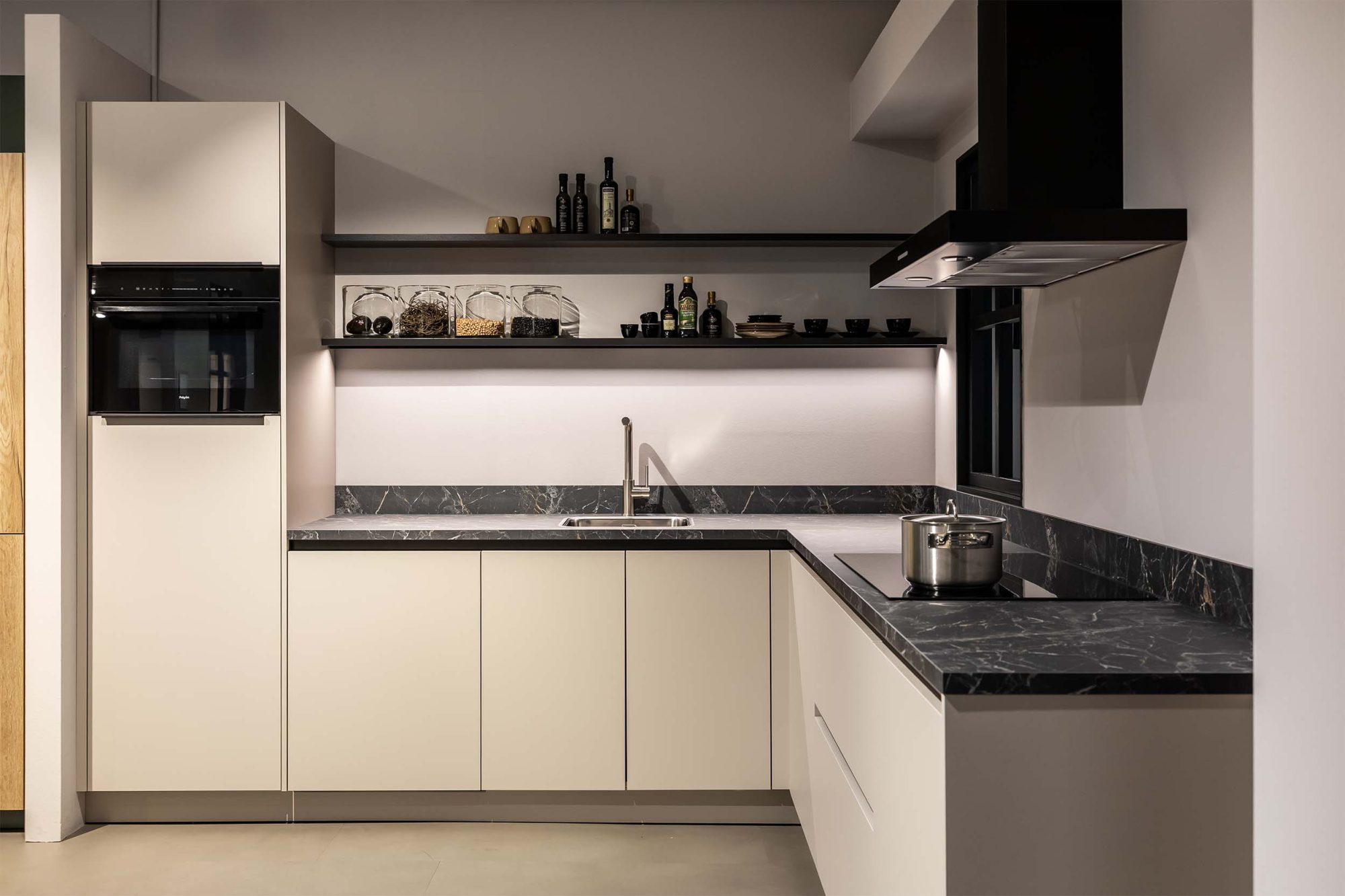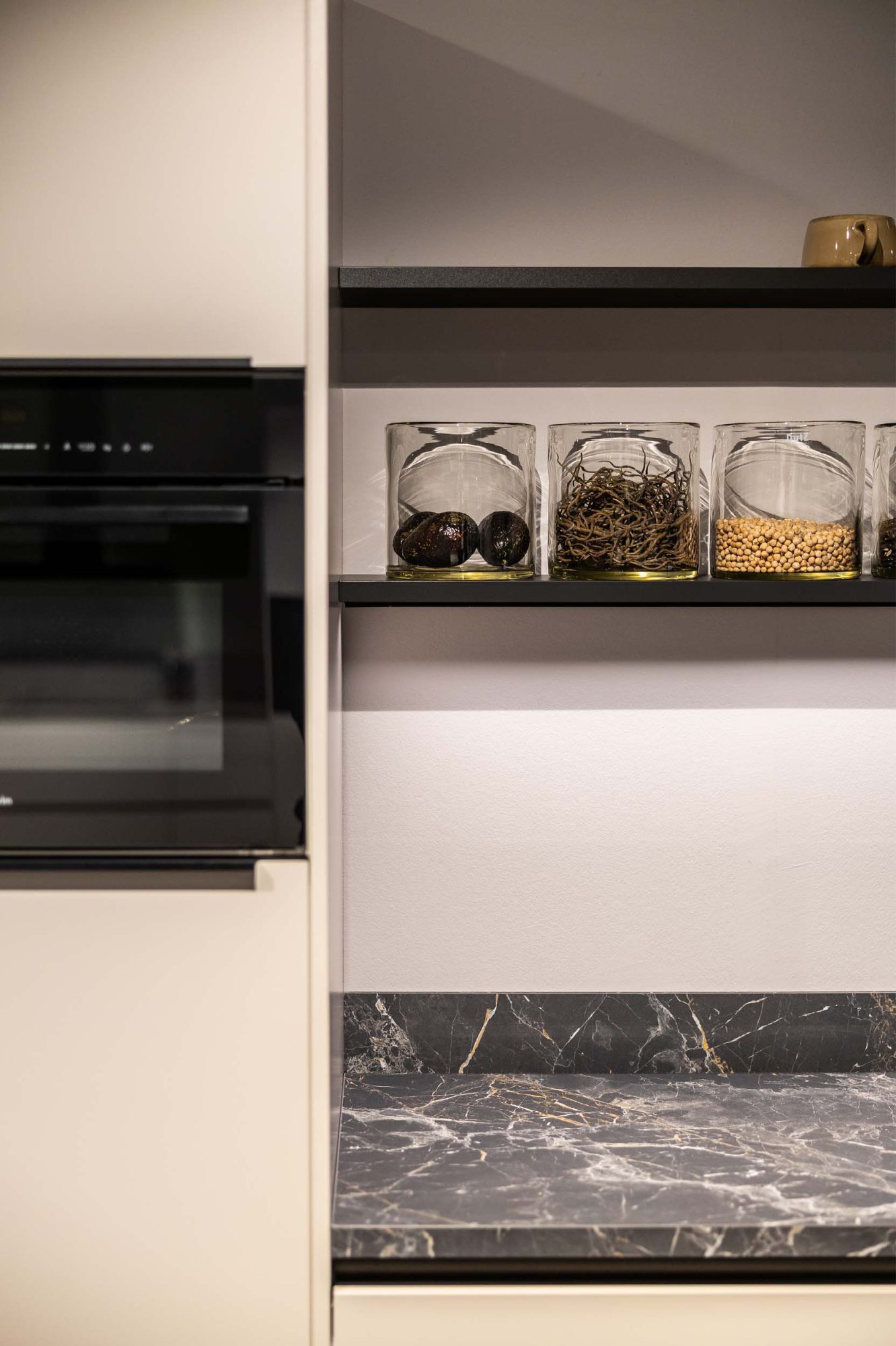 Ontdek de rust en eenvoud van deze keuken, waar luxe geaderde werkbladen en strakke wandschappen verrassende details onthullen. Laat u inspireren door de allure die deze serene basis biedt.