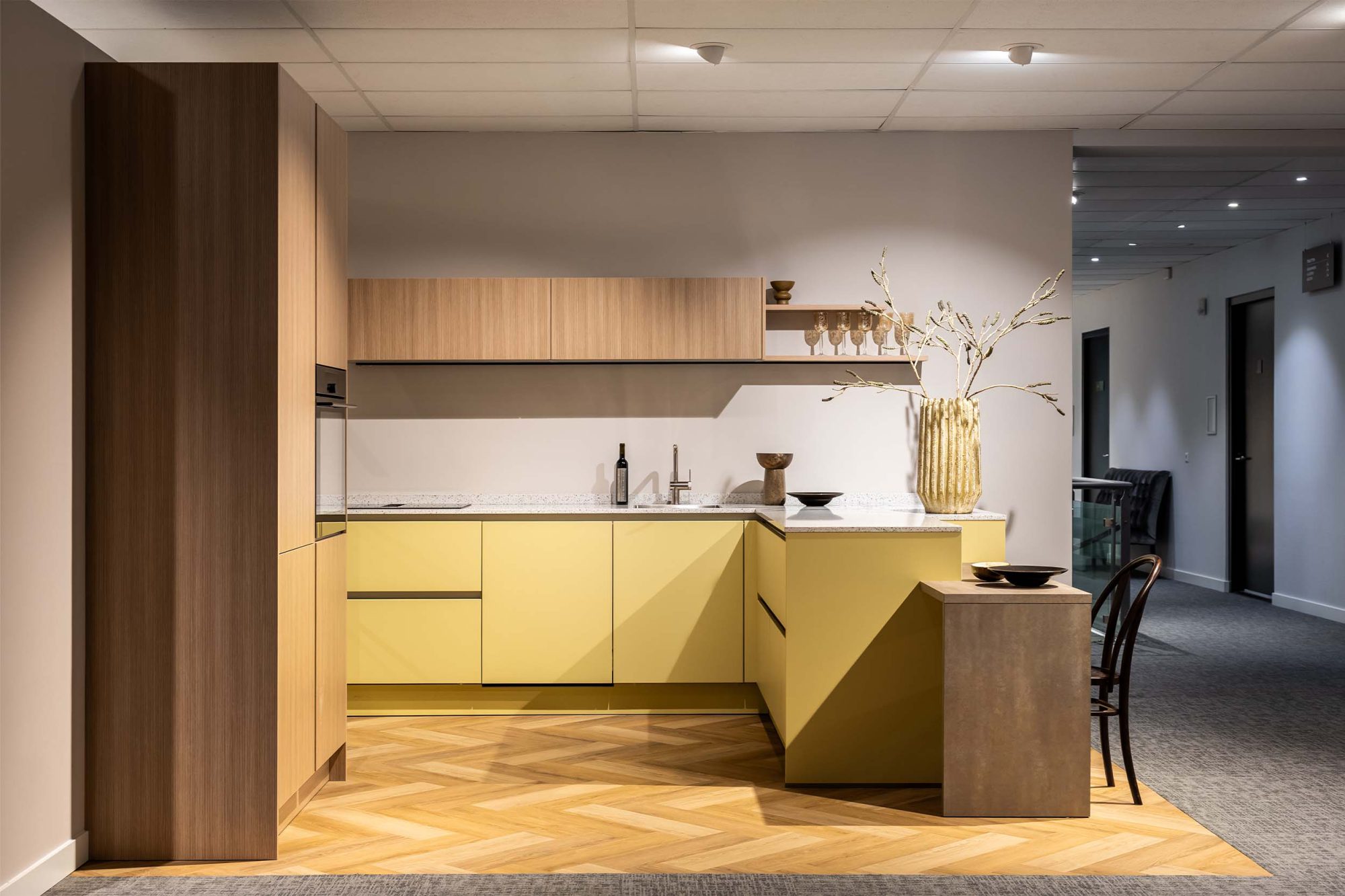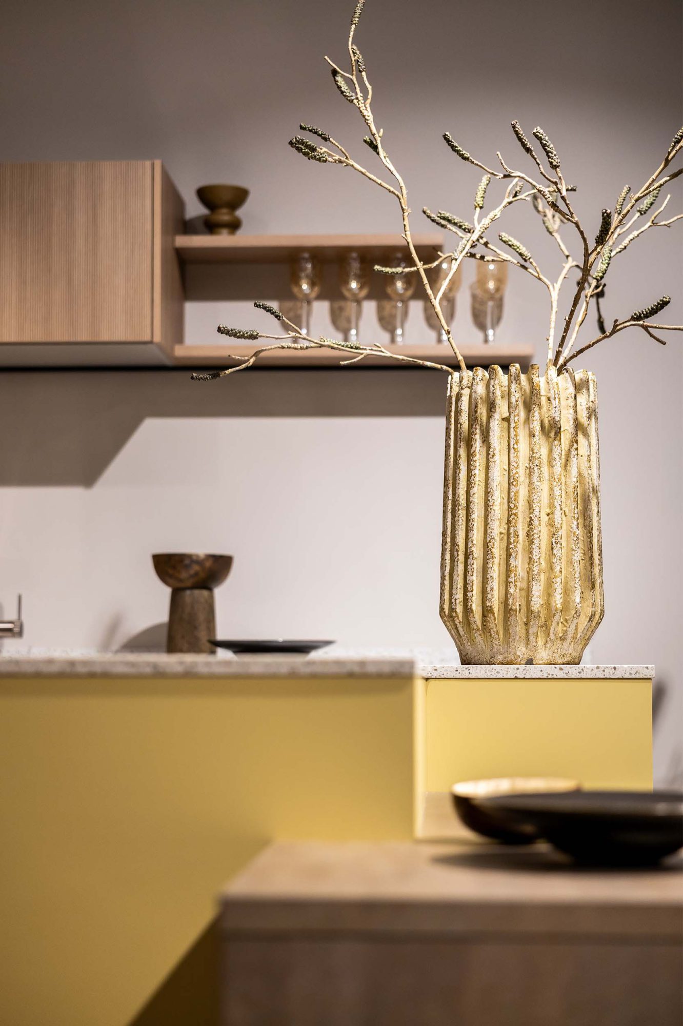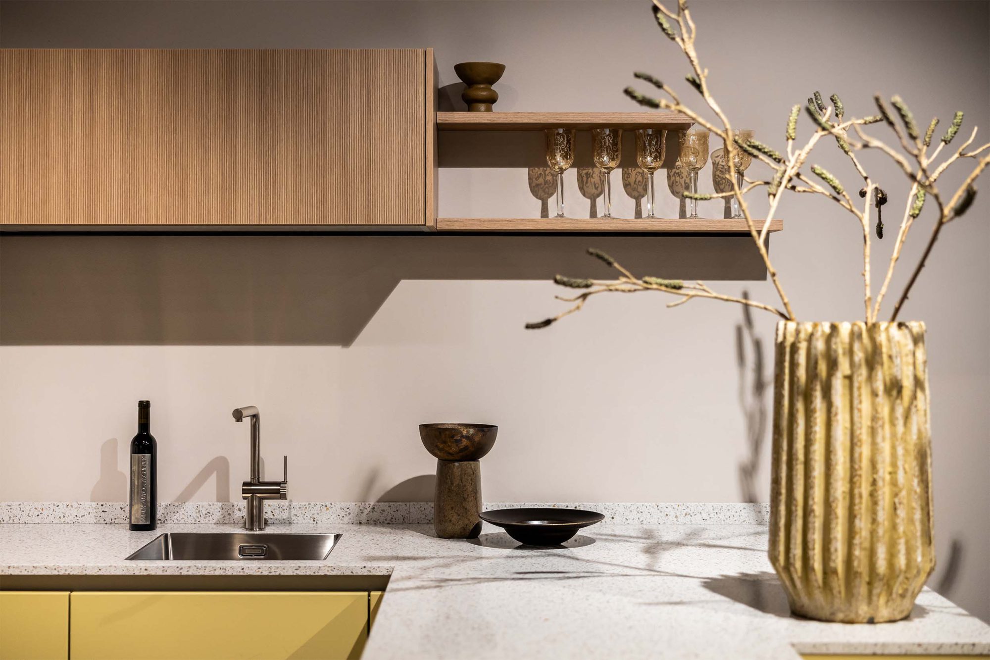 Ervaar de charme van een eigentijdse keuken met een warm gele uitstraling en een werkblad geïnspireerd op vintage terrazzo. De houten kastenwand met ribbeloptiek voegt speelse textuur toe, waardoor retro en modern perfect samenkomen.