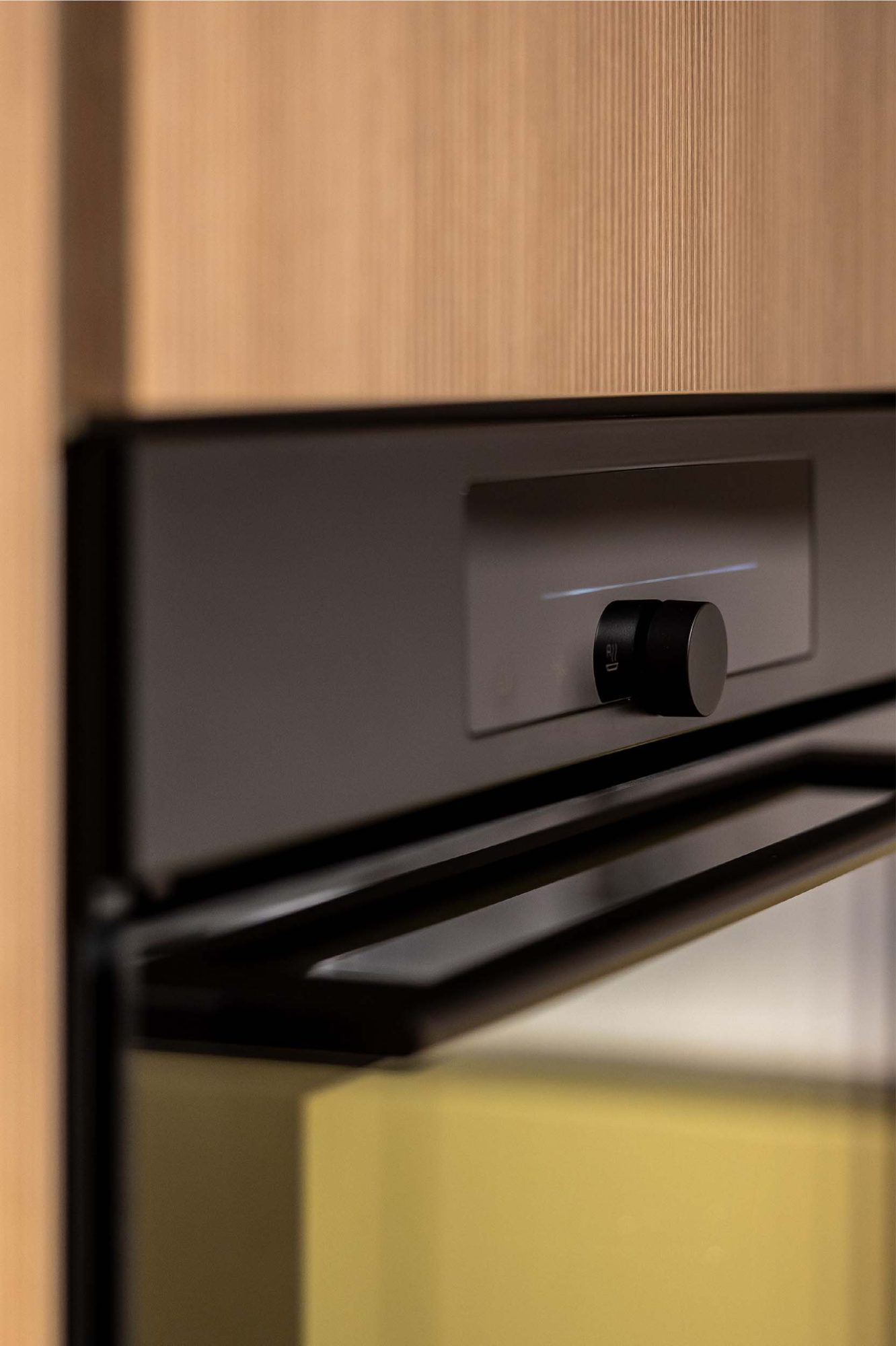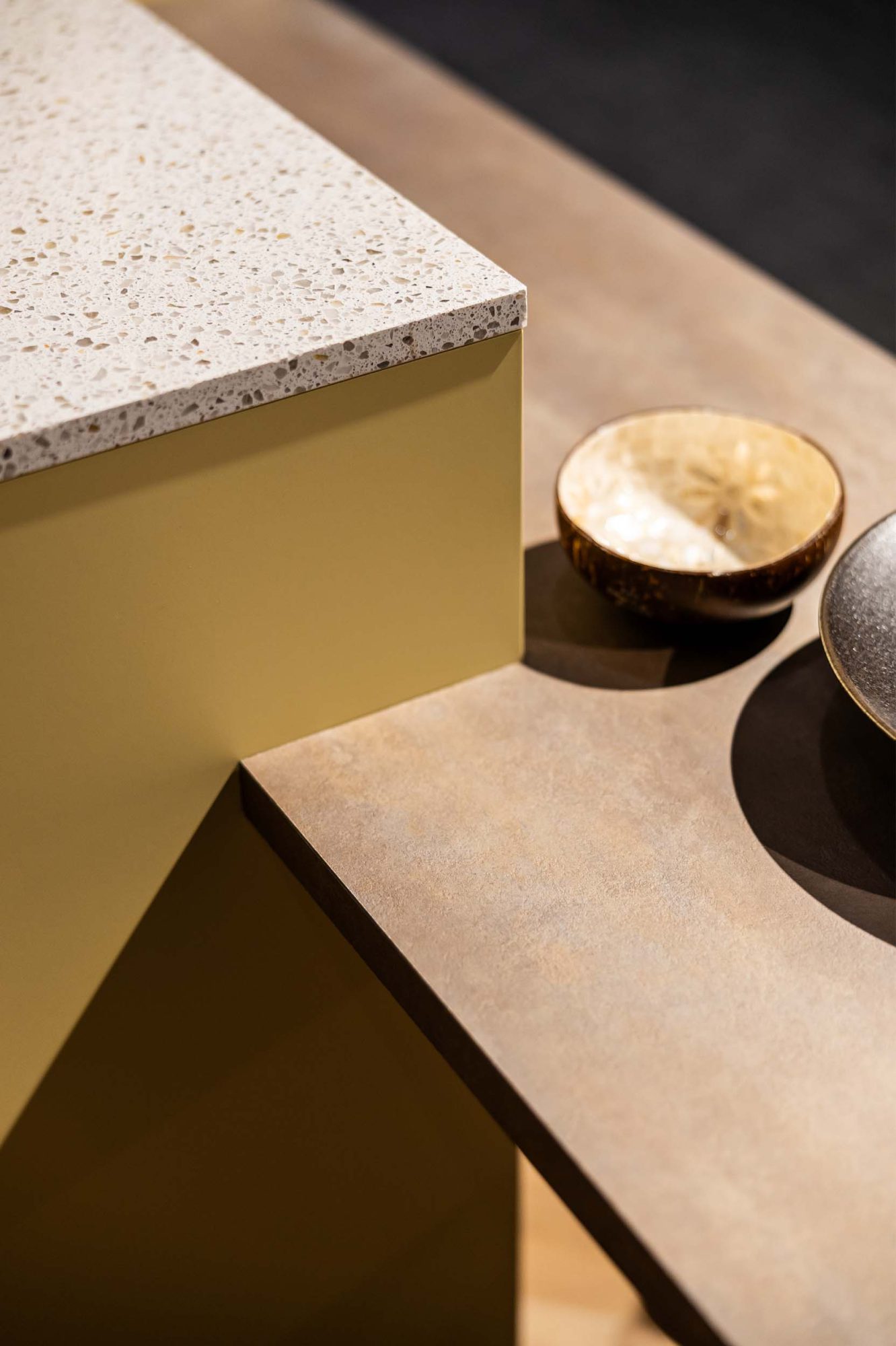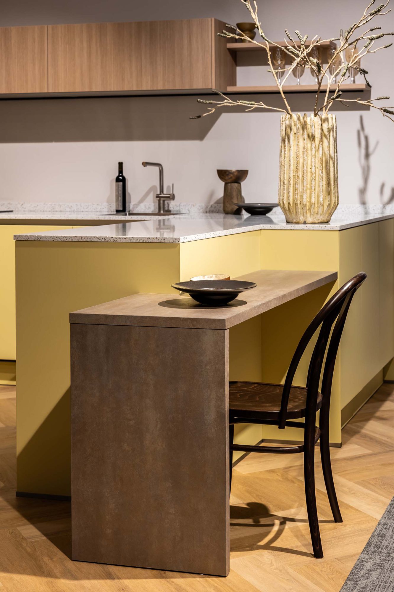 Ervaar de charme van een eigentijdse keuken met een warm gele uitstraling en een werkblad geïnspireerd op vintage terrazzo. De houten kastenwand met ribbeloptiek voegt speelse textuur toe, waardoor retro en modern perfect samenkomen.