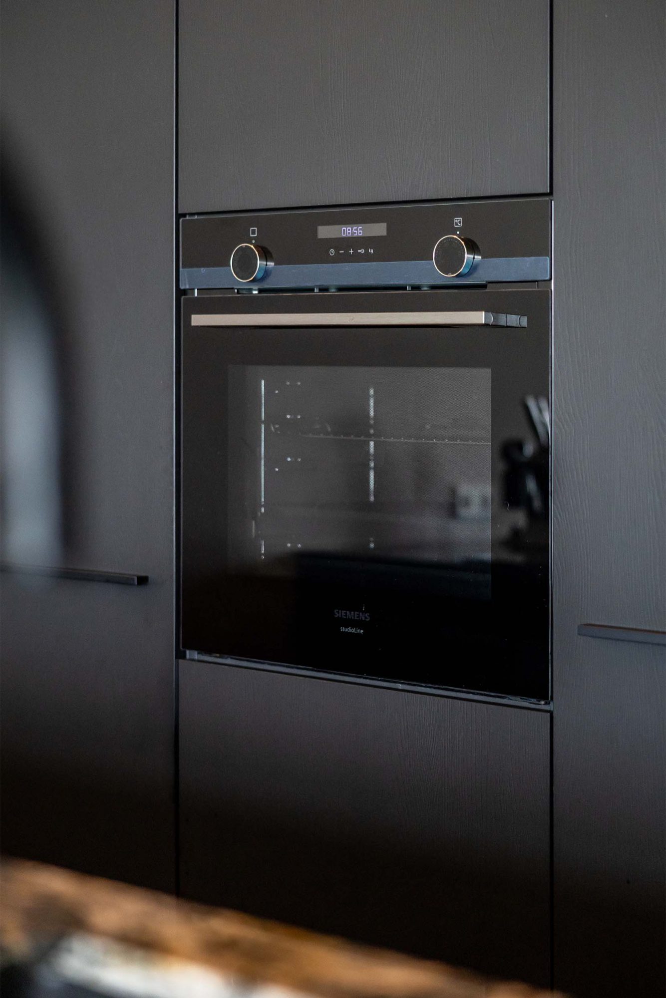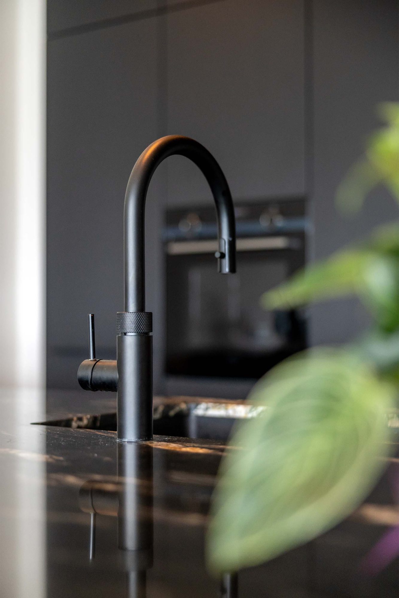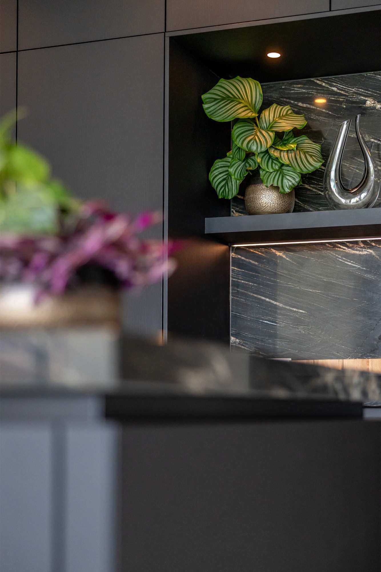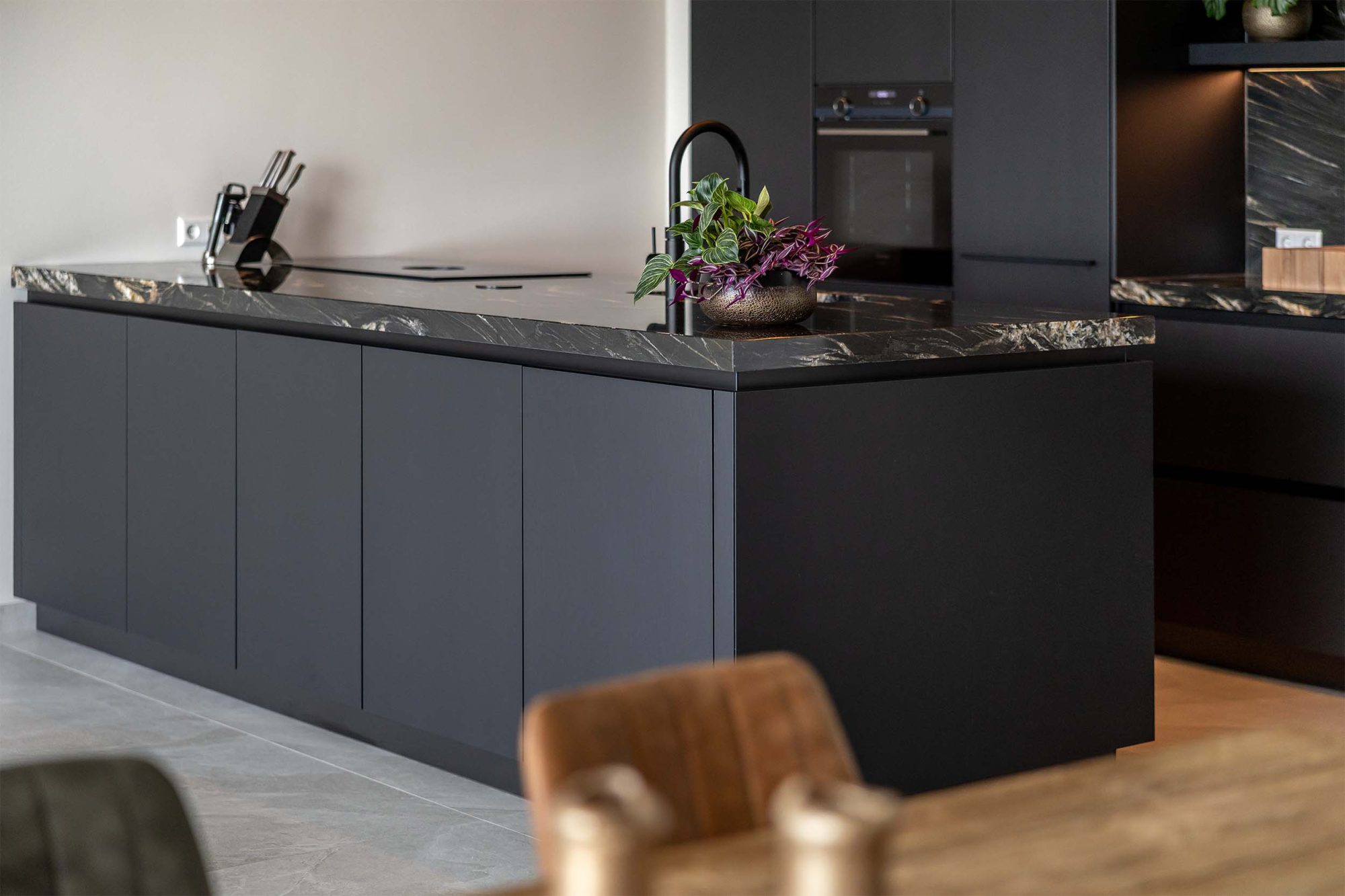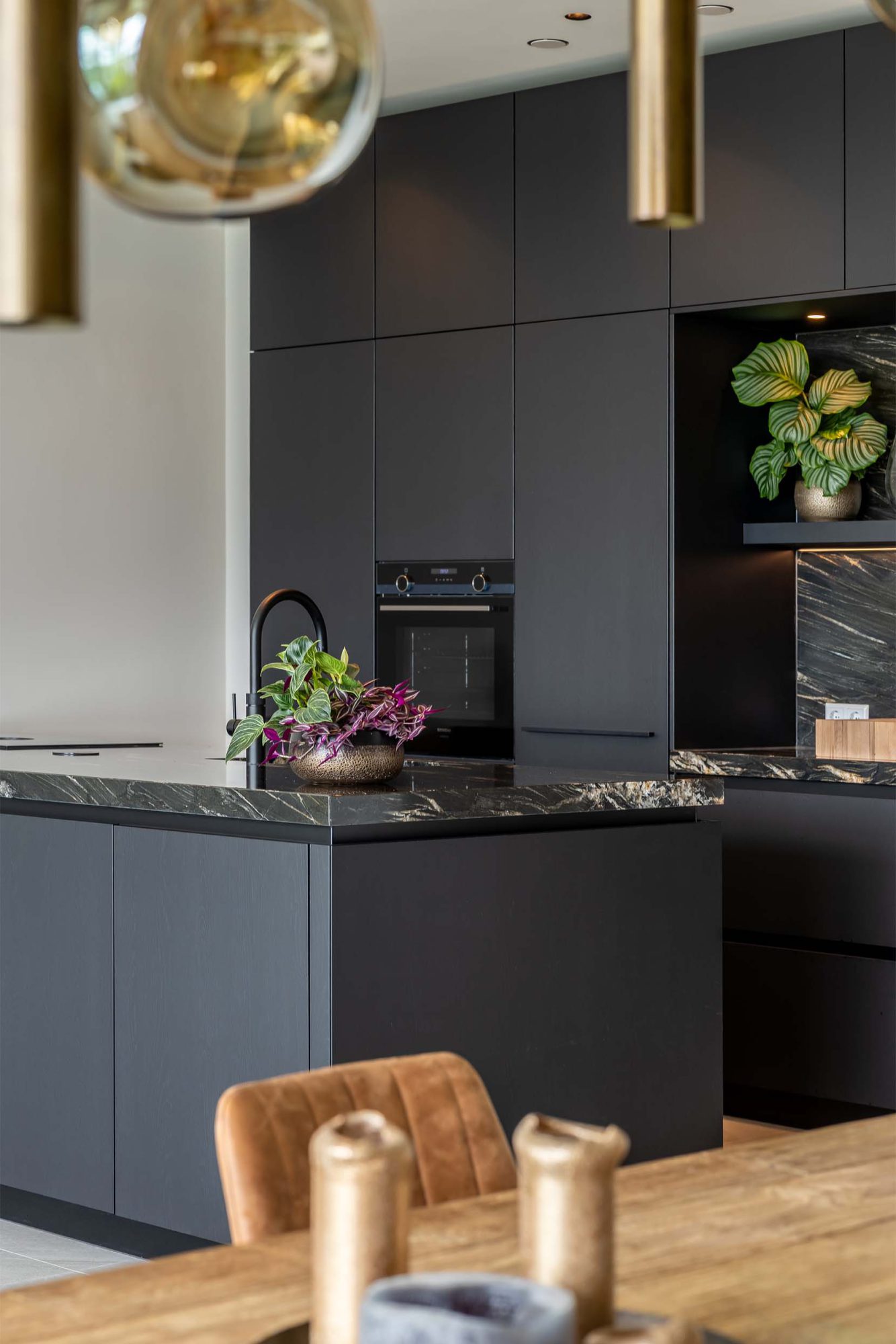 Deze chique keuken straalt elegantie en rust uit, met een werkblad dat een prachtig natuurlijk verhaal vertelt. De subtiele levendigheid en luxe details maken het geheel bijzonder, waardoor koken hier niet alleen functioneel is, maar ook een stijlvolle beleving wordt.