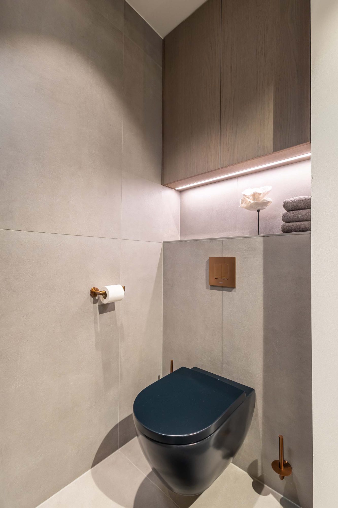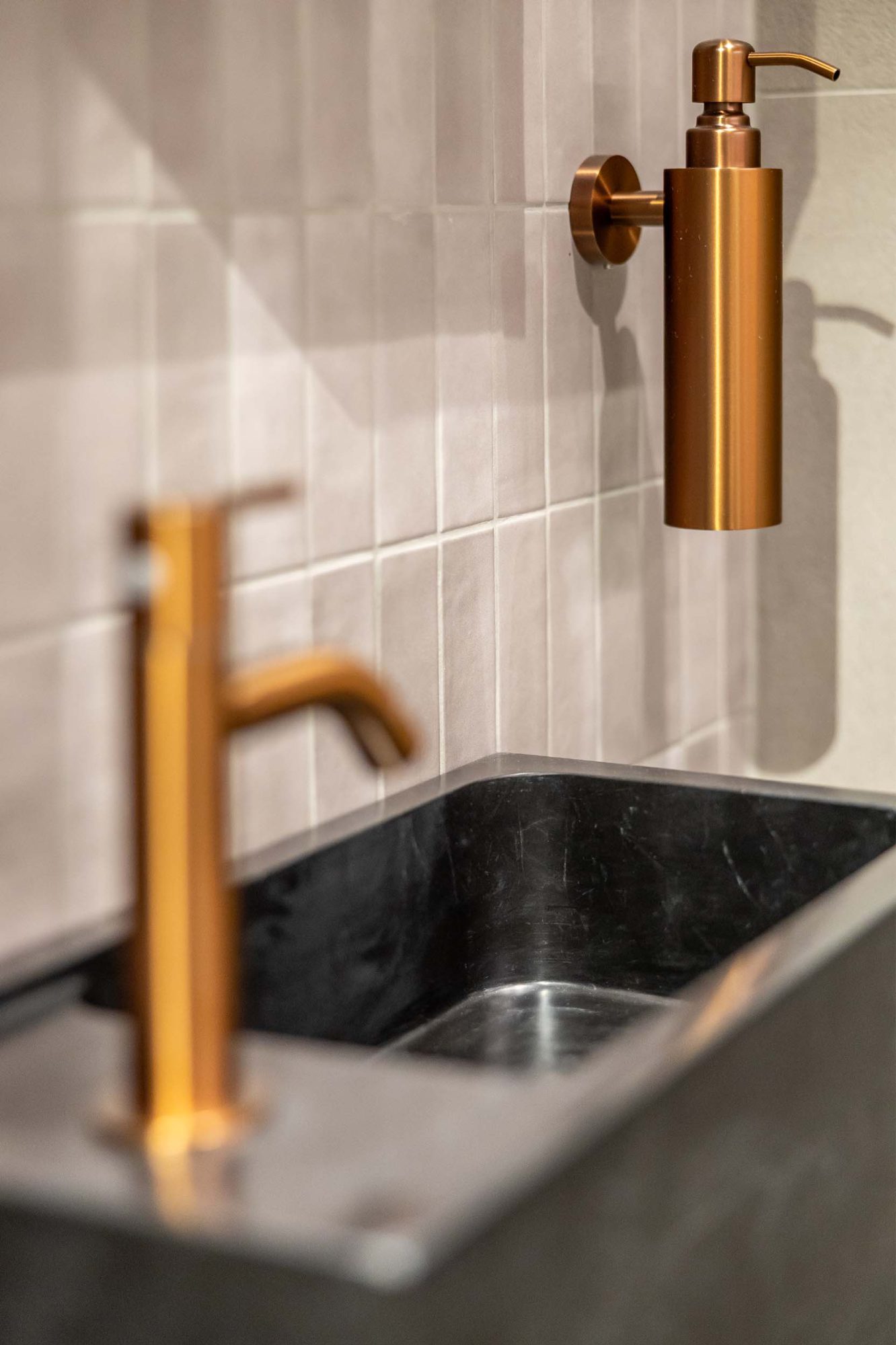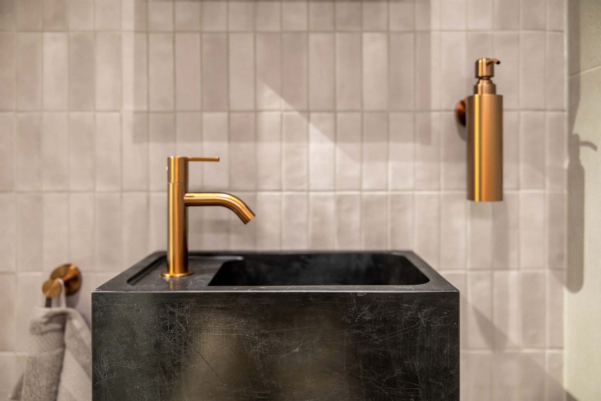 De Cement serie tegels, gecombineerd met een maatwerkkast van ELISE en een marmeren fontein van Detremmerie, zorgen voor een verfijnde mix van luxe en functionaliteit. Het resultaat? Een verbluffende badkamer.