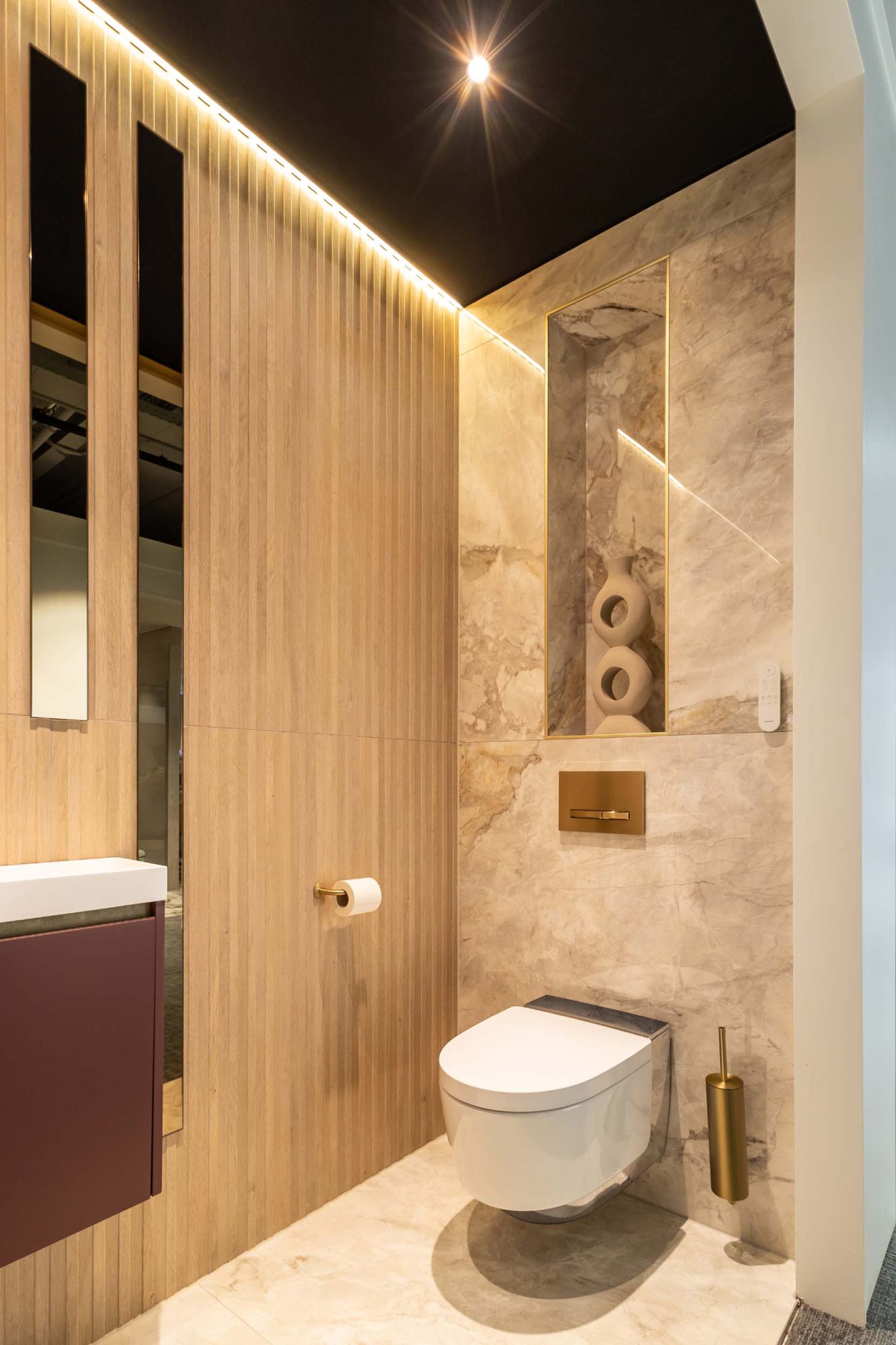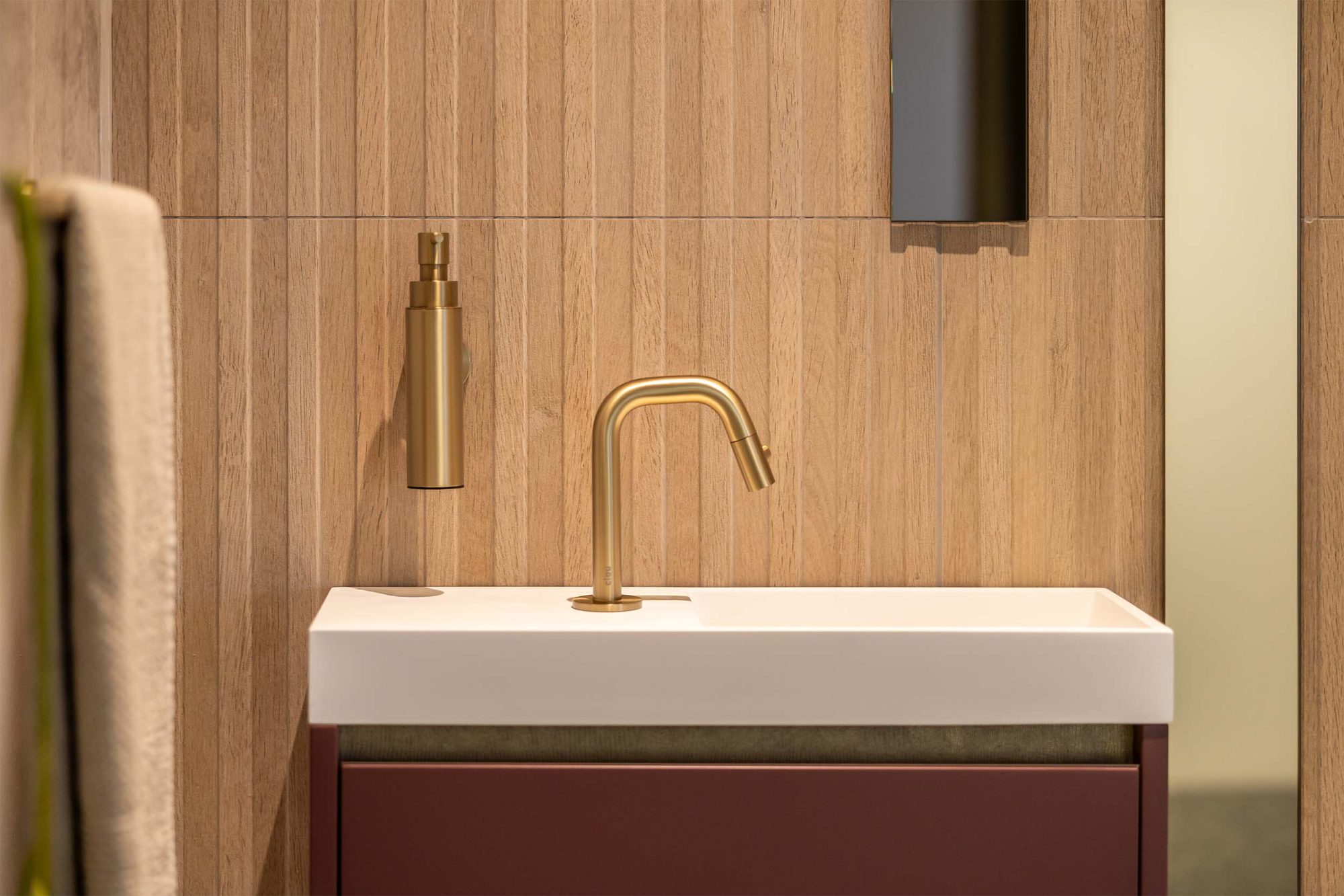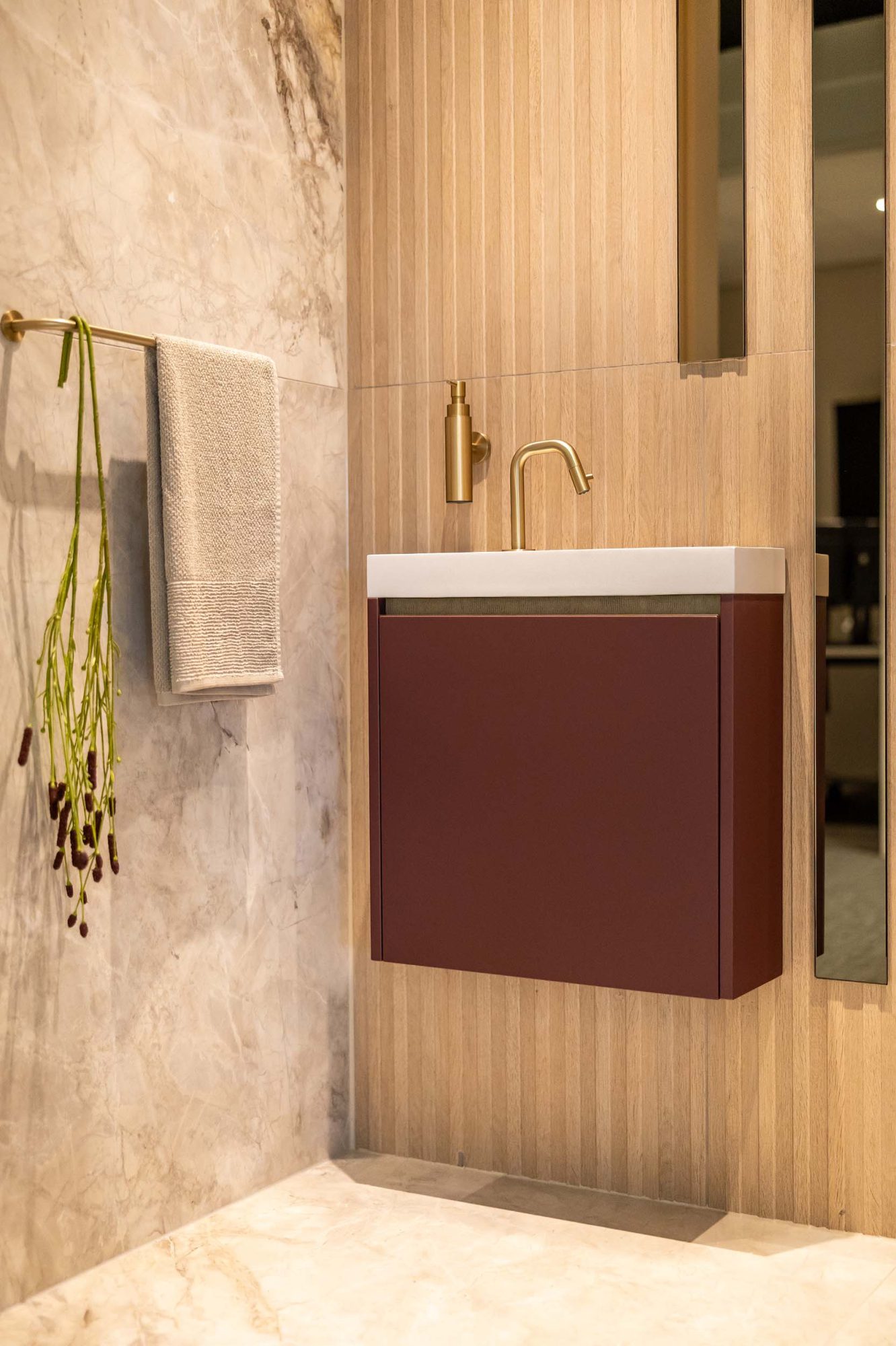 Dit hotel chique toilet combineert luxe natuurlijke materialen met een warm pastelkleurig meubel voor een elegante sfeer. Bronskleurige spiegels en messing accenten voegen verfijning toe, waardoor uw toilet de perfecte balans tussen luxe, stijl en functionaliteit biedt.